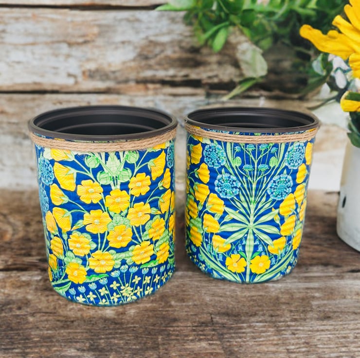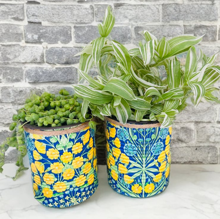 A rich blue background sets off a bright yellow plant design, creating a bold and cheerful planter. Perfect for adding a pop of colour and personality to your windowsill, shelf, or desk. Ideal for herbs, cuttings, or small houseplants – each one is handmade with care and full of character.