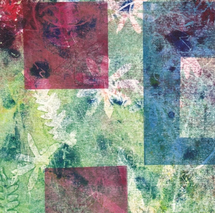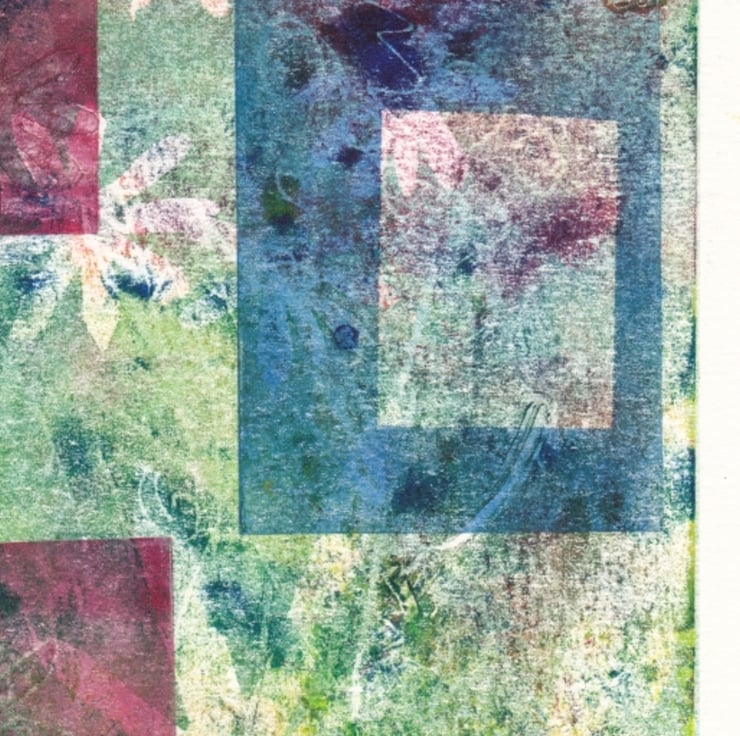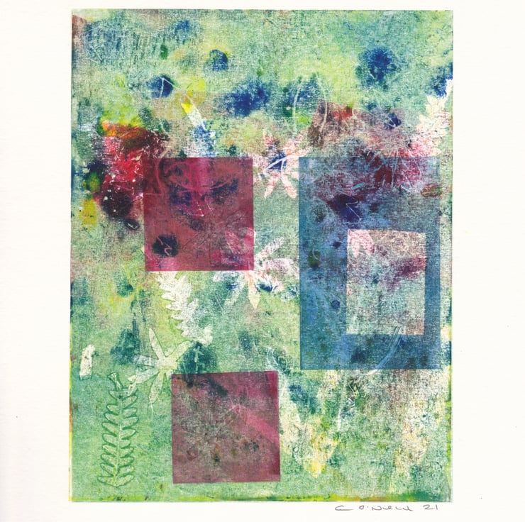A delightful monoprint evoking the hot summer days. When the garden is a little bit dusty and dry and the flowers are loosing a little bit of their vibrancy but still managing to squeeze out a little bit of pastel colours. I have used leaves from my garden in the print and cut out daisy shapes. The rectangles are the patio pots. The more you look at this print the more you will see.