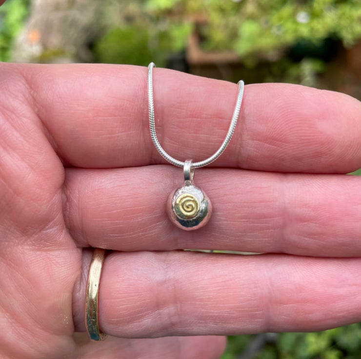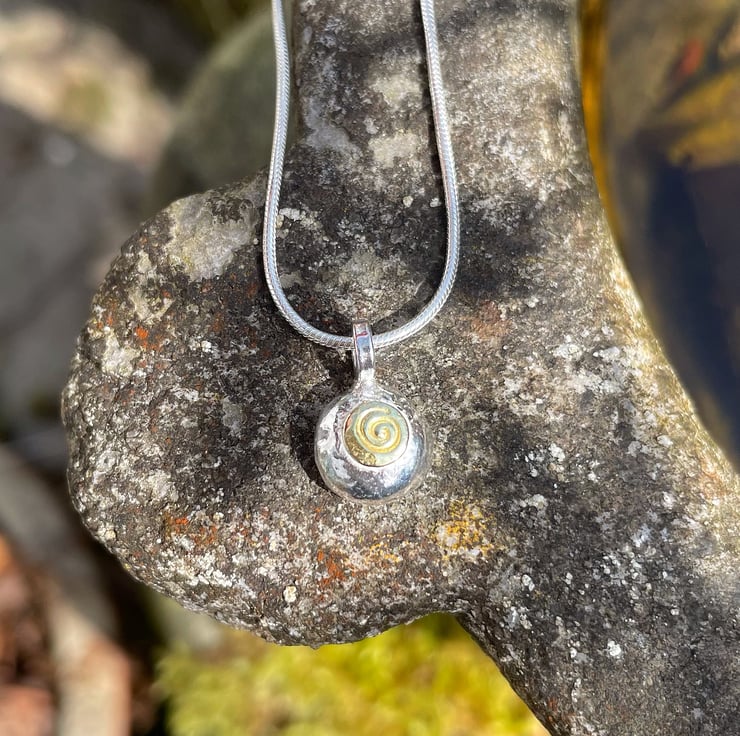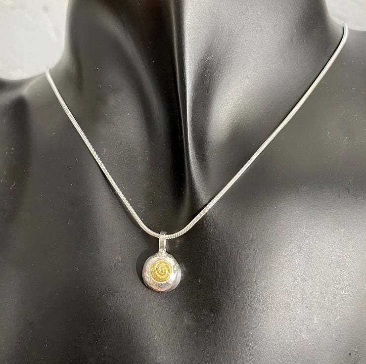 A solid, recycled sterling silver pebble with gold detail stamped with a spiral. The pendant is roughly a round shape, it has a beaten texture and has been polished to a subtle shine.