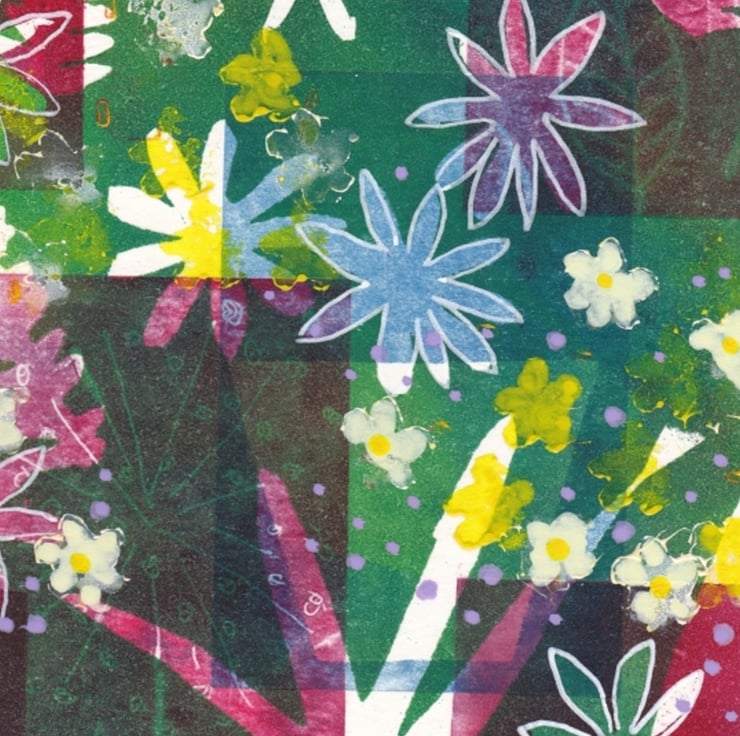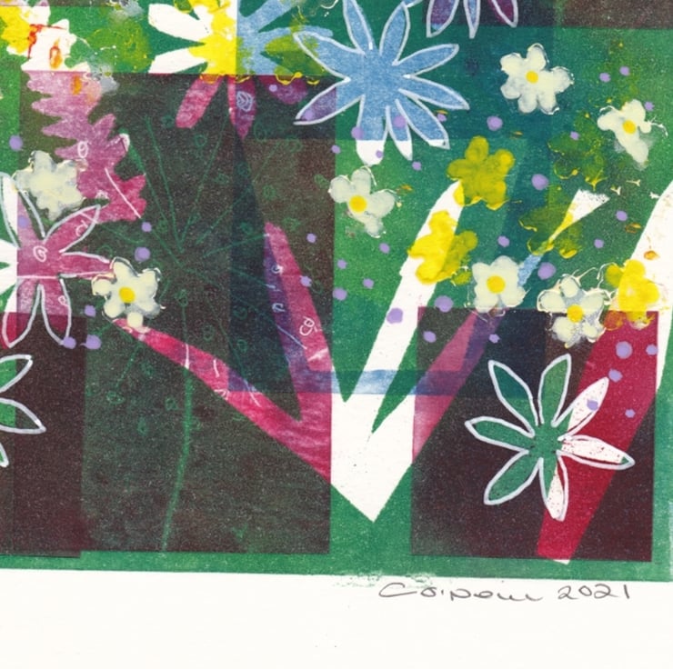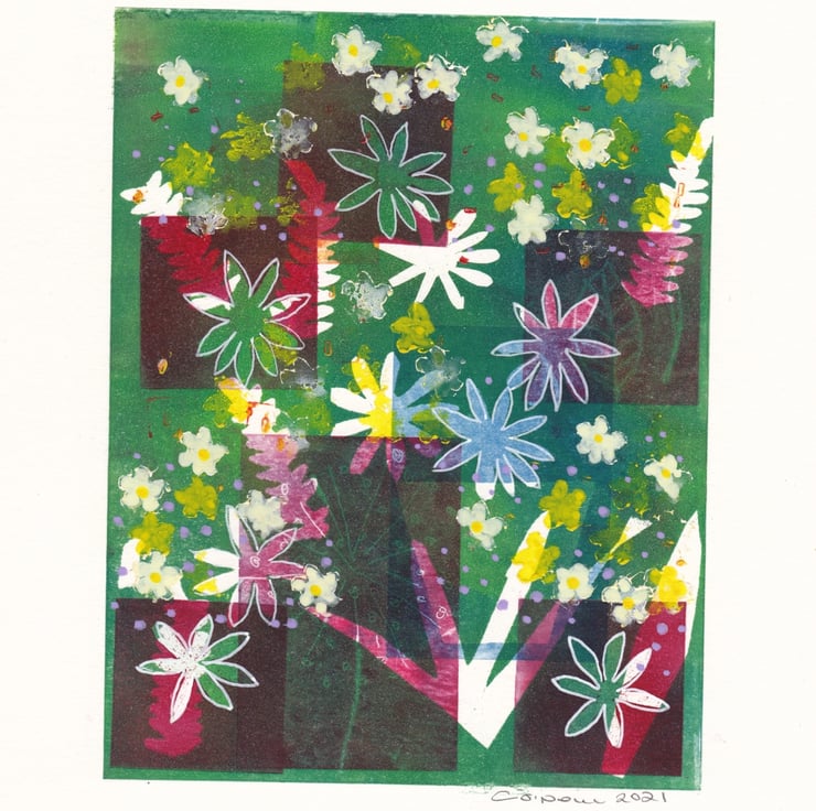 A vibrant garden of greens and pinks. A multi layered monoprint with highlights in acrylic pen and paints. Leaves from my garden used in the printing process. This colourful print will brighten up any corner of the room reminding you of summer.