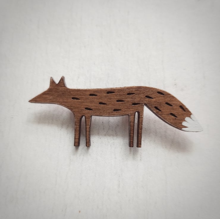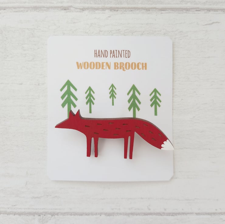 The fox is made from high quality laser-cut and engraved birch plywood which has been handpainted. It measures approx 6cm at it's longest point. It has a metal pin fastening on the back, and comes attached to a backing card - ready to give as a gift or keep as a present to yourself!