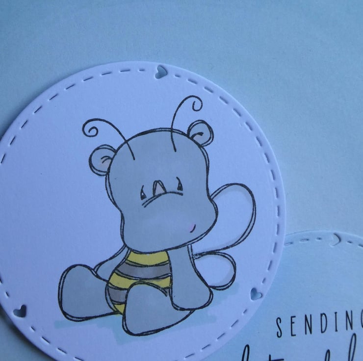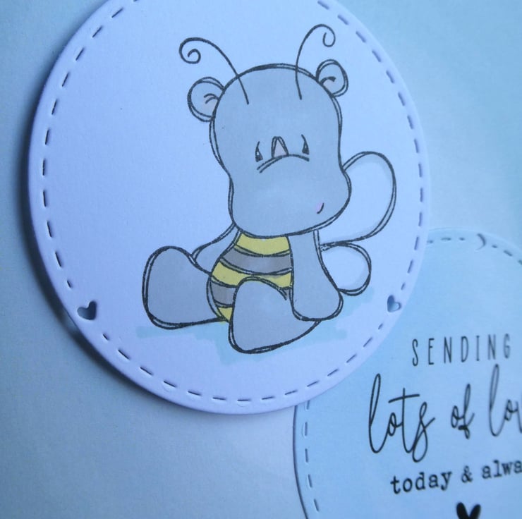 The image of a sweet rhinoceros wearing a stripey black and yellow top, antenna and wings has been hand stamped and inked onto a circle of white card with tiny die cut hearts and stitched edge detail. The image has been slightly raised on foam pads above background paper printed with a swirl design in shades of soft sage, aqua and white.