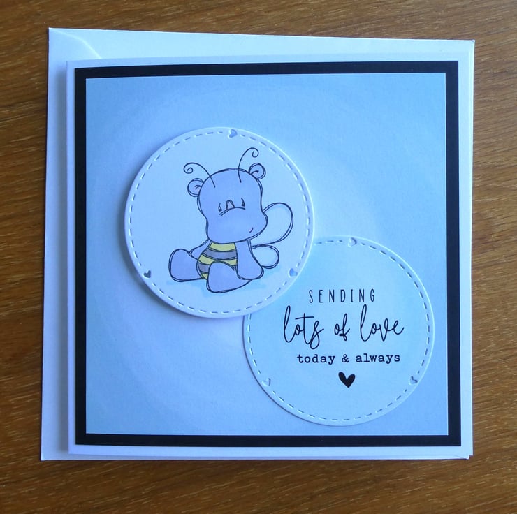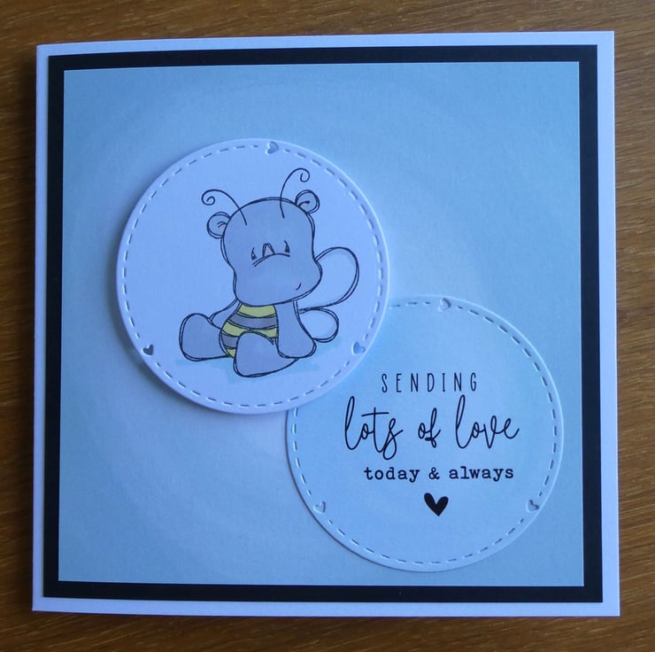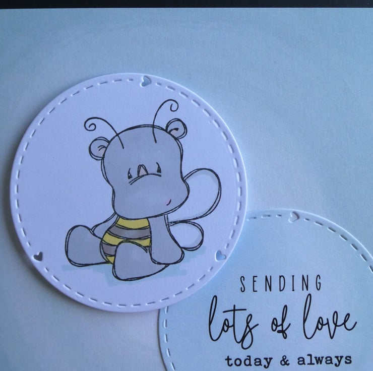 The message 'sending lots of love today & always' is printed onto a matching die cut paper circle with a soft aqua watercolour effect background. The message has been offset on the right hand edge of the card.