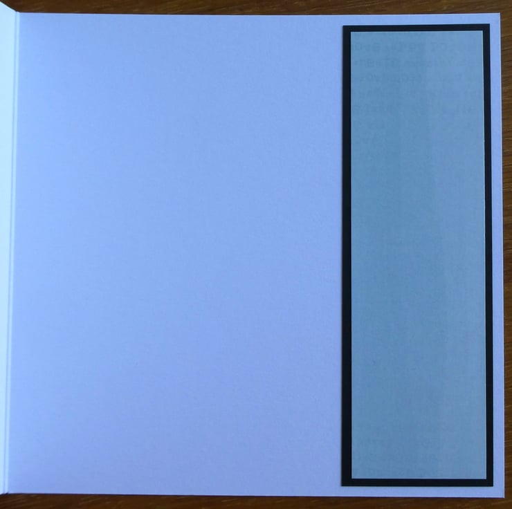 Inside the card is a co-ordinating band of aqua paper, this time with a random text design, with a black card frame, running down the right hand edge.