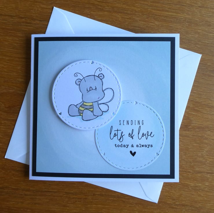 With the message 'sending lots of love today & always' this birthday card has a cute image of a rhino wearing a bee costume against a pale aqua green swirl background.