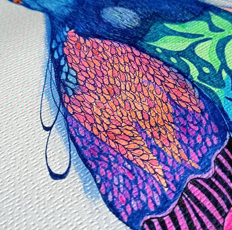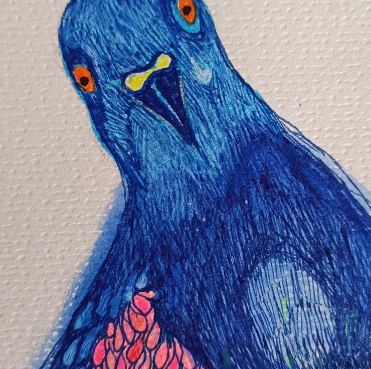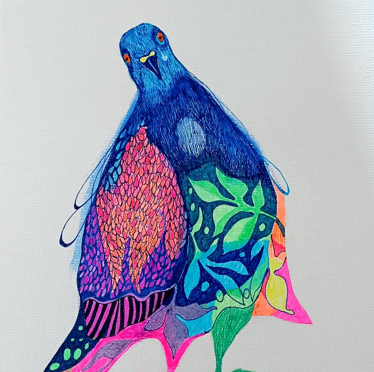 Ink on acid free A4 sized watercolour paper. Abstract pigeon artwork drawn with ink and bright colours.Using dynamic composition and bold colors I try to convey the pigeon's energy and movement, capturing a sense of its liveliness. Would definitely brighten up your space and mood!!!
