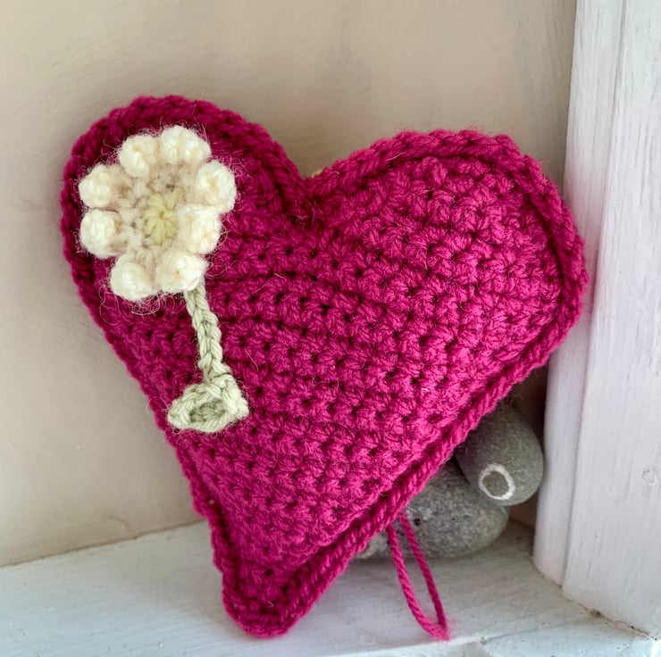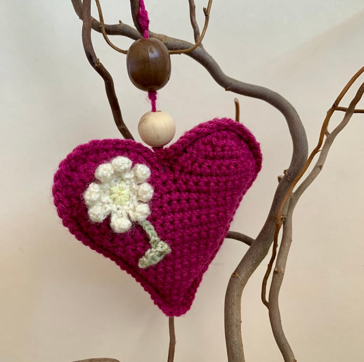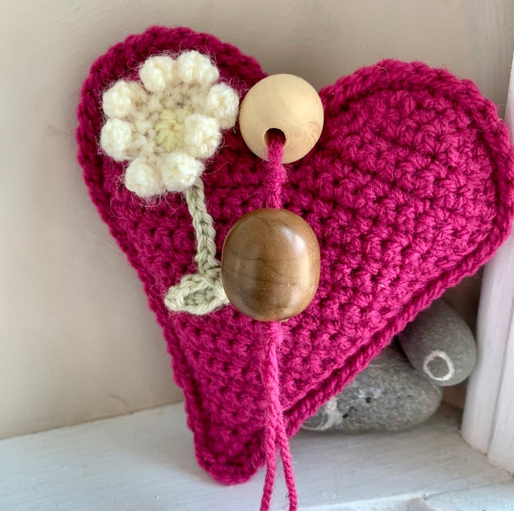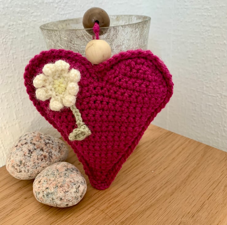 Crocheted with deep pink acrylic yarn two hearts are joined and a cream crochet daisy is sown on to decorate one side of the heart. The heart is stuffed with wool fibre and has a pink yarn hanging thread, with wooden beads.