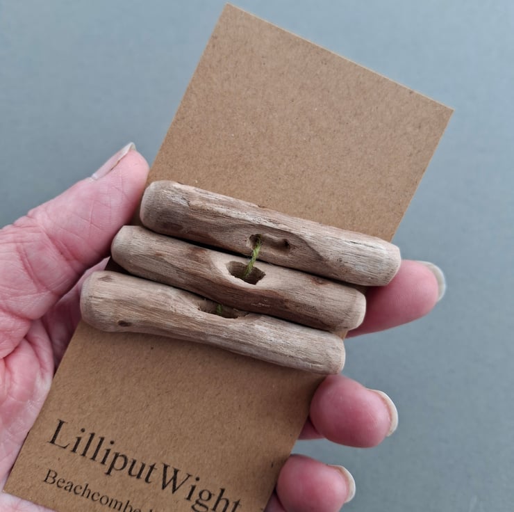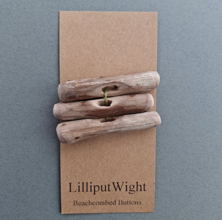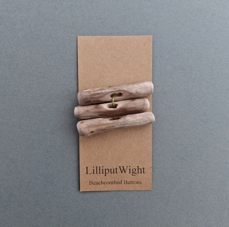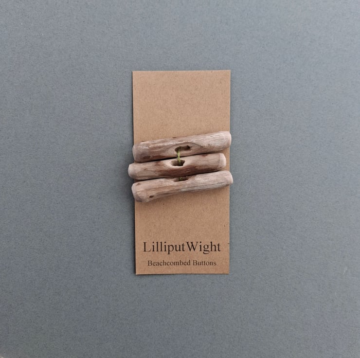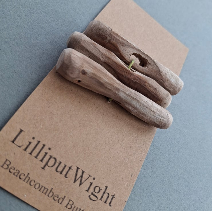 These buttons have been handmade by me in my dad's shed. The driftwood has been collected during walks on the beach before being washed and dried and making the short trip to the shed.