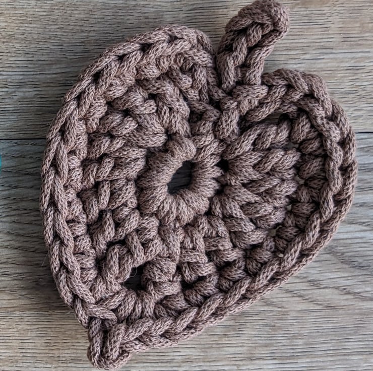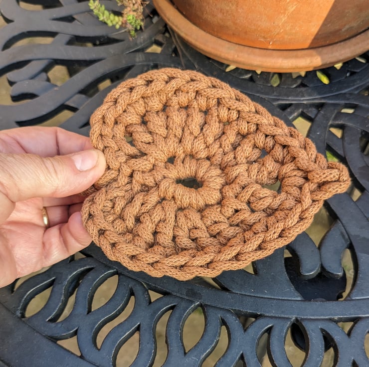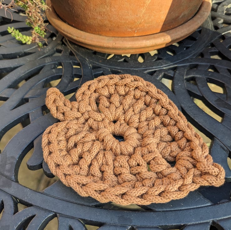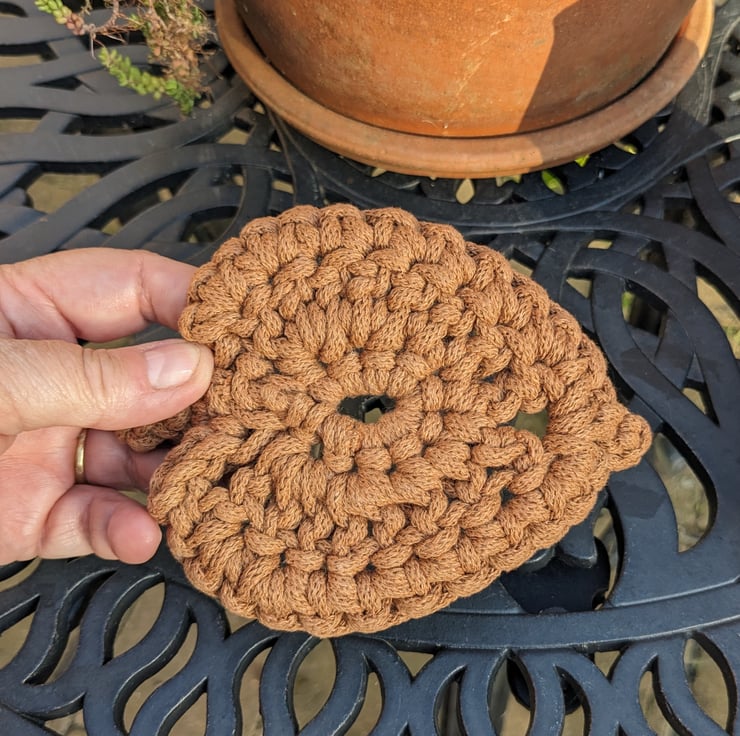 A crocheted coaster made from a high quality recycled cotton braided cord in a warm shade of brown.