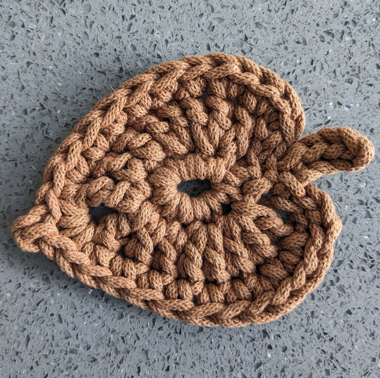 The coaster has a slightly pliable structure but sits flat on a surface. The crochet stitches provide added texture and interest.