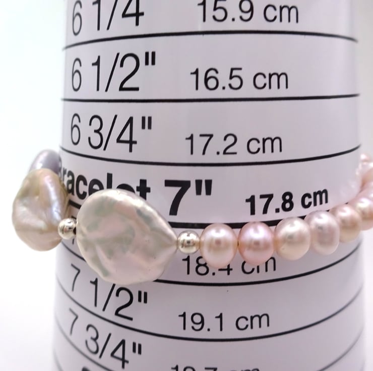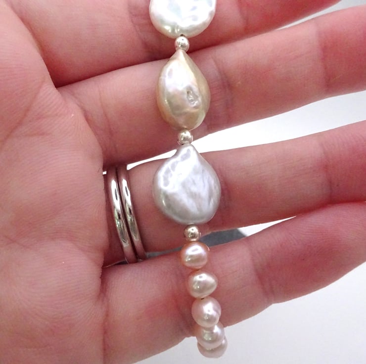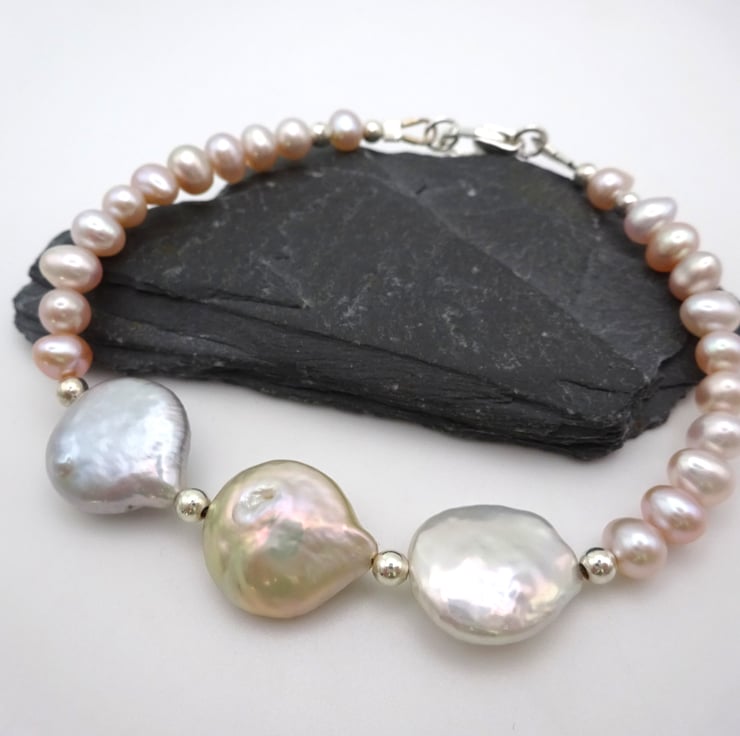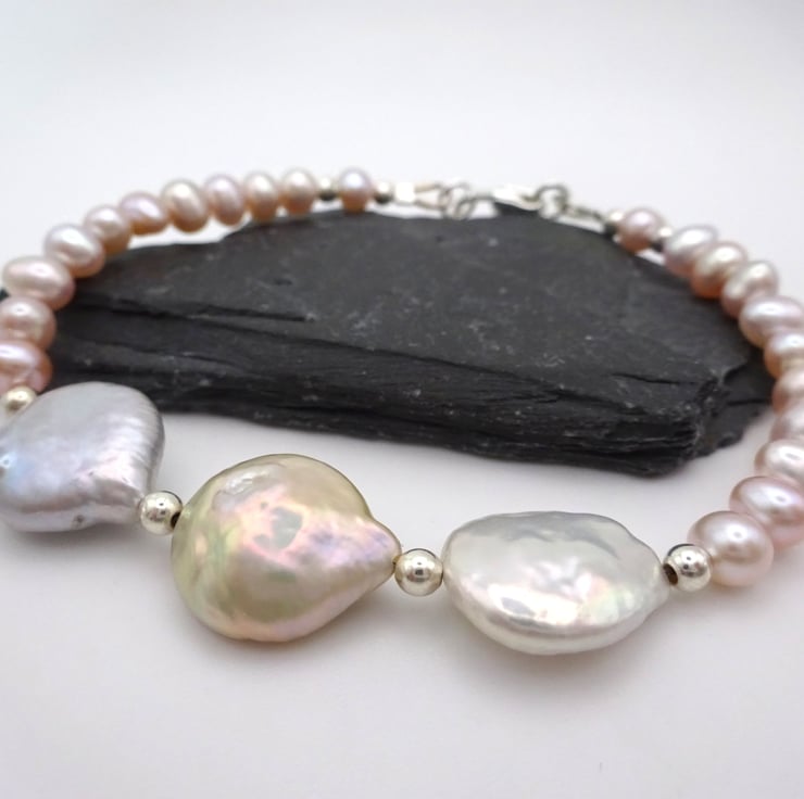 A bracelet made with freshwater pearl beads, sterling silver beads and three oval shaped freshwater pearl bead as a focal.