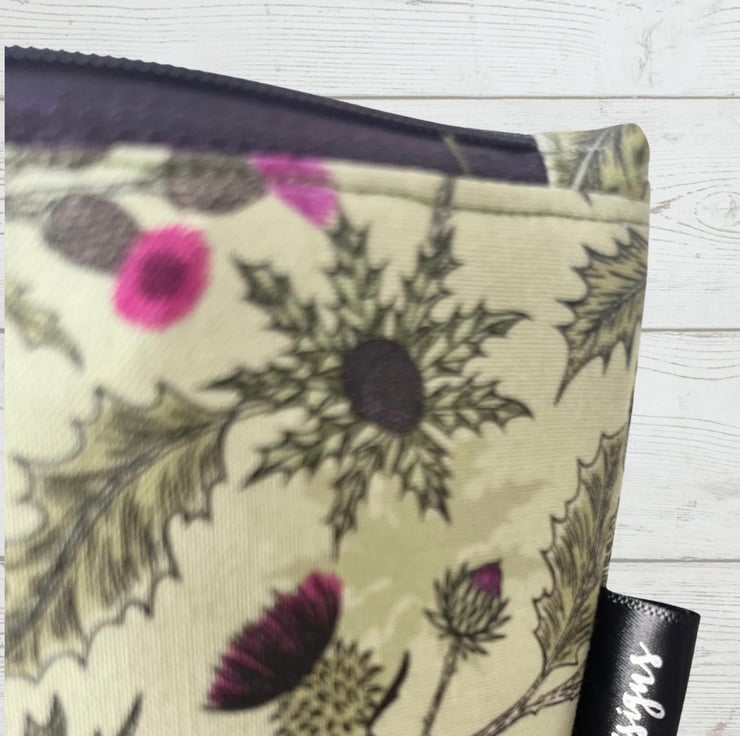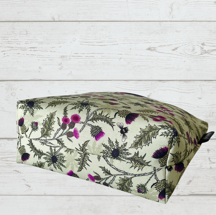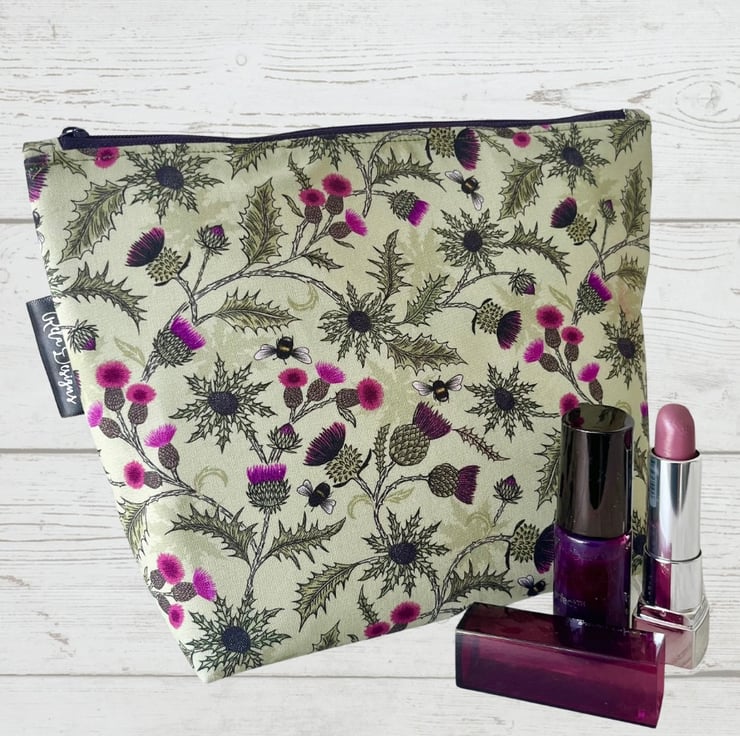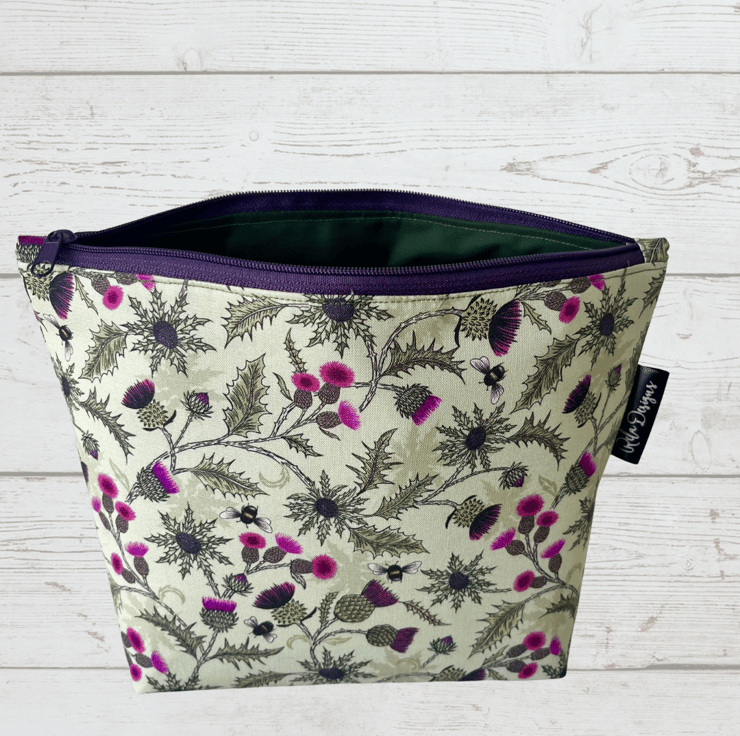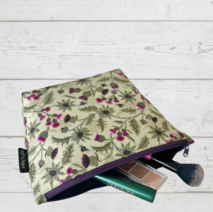 This gorgeous thistle and bee print by Lewis & Irene cotton zipped pouch has a khaki waterproof nylon lining , great for those inevitable spills.