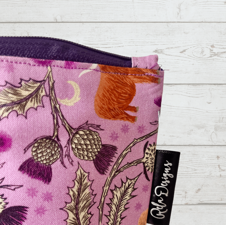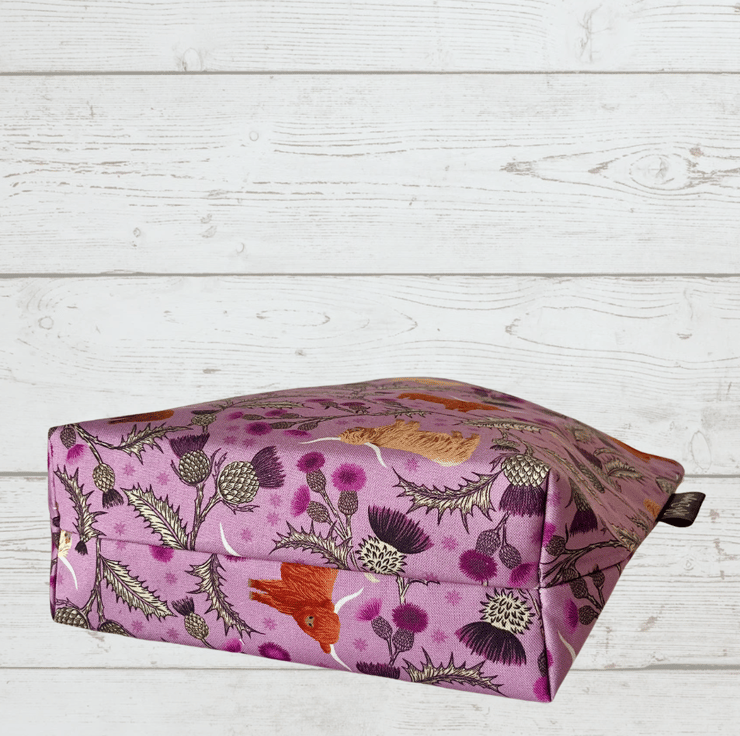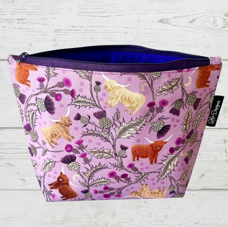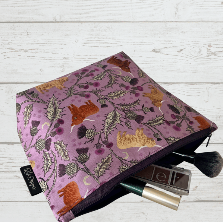 Stay organised in style with this charming large makeup bag! Featuring a unique cotton fabric with adorable Highland cows, Scottish thistles, and holly leaves on a soft lilac background, this bag is as functional as it is beautiful.