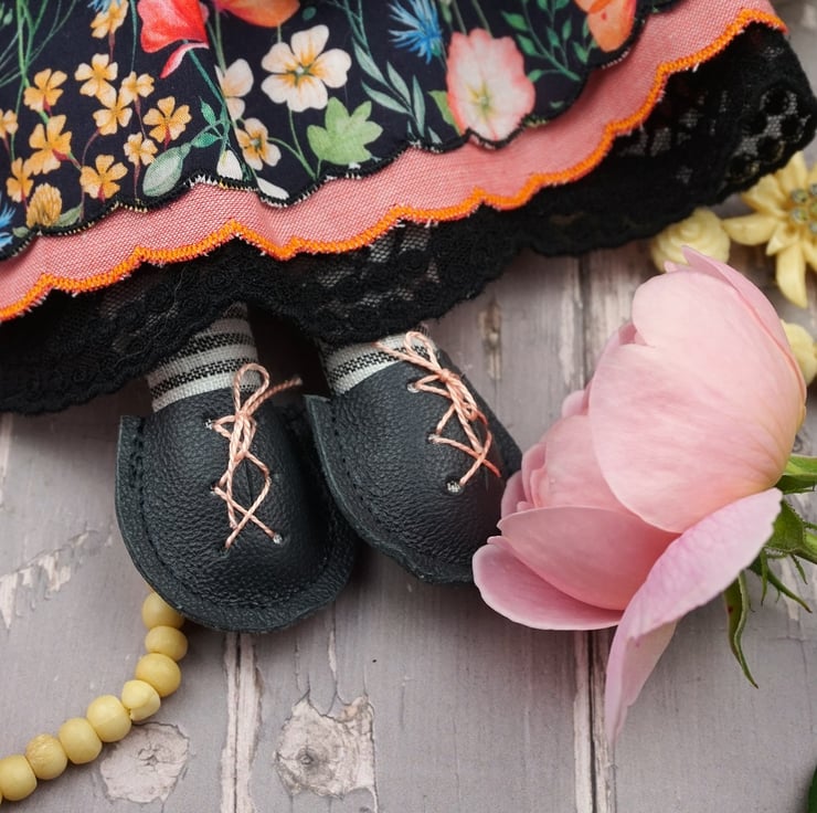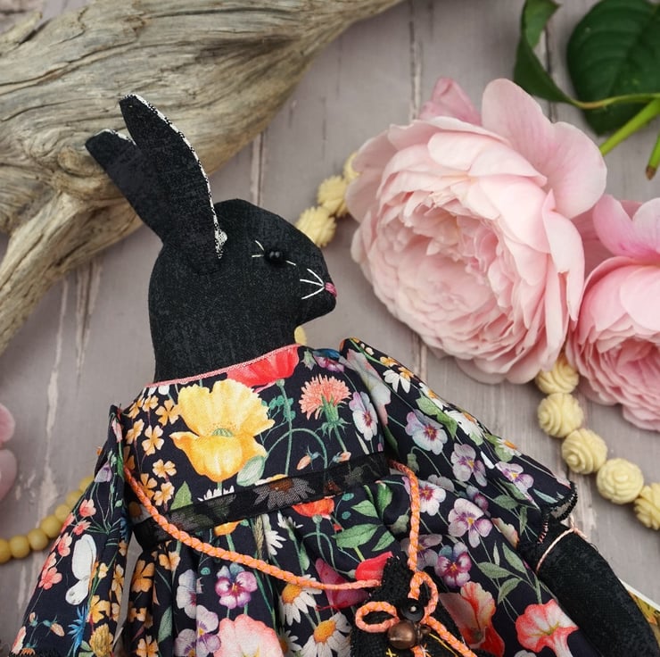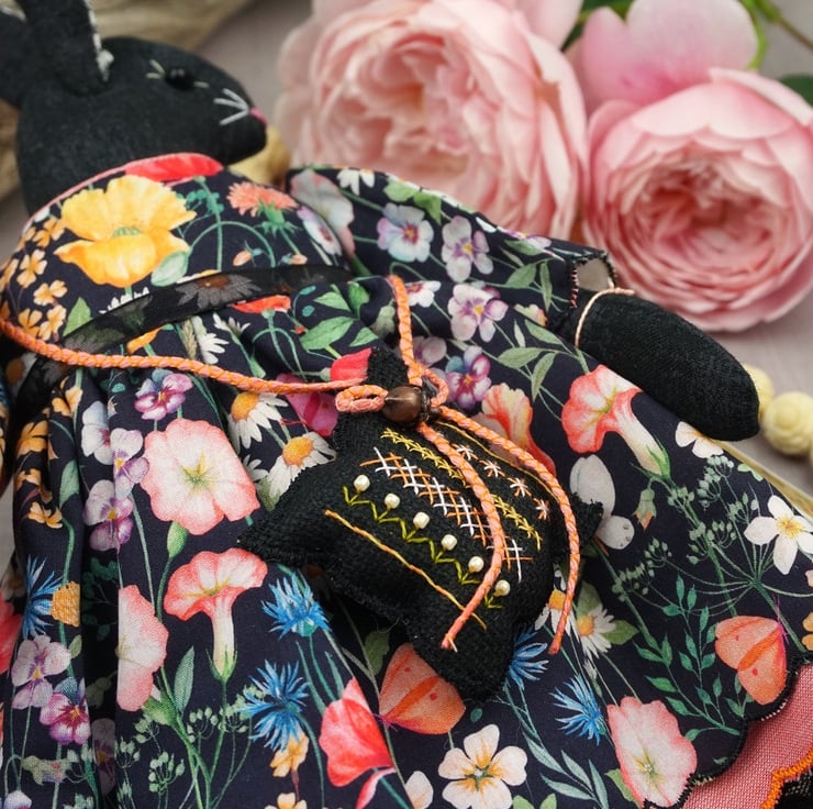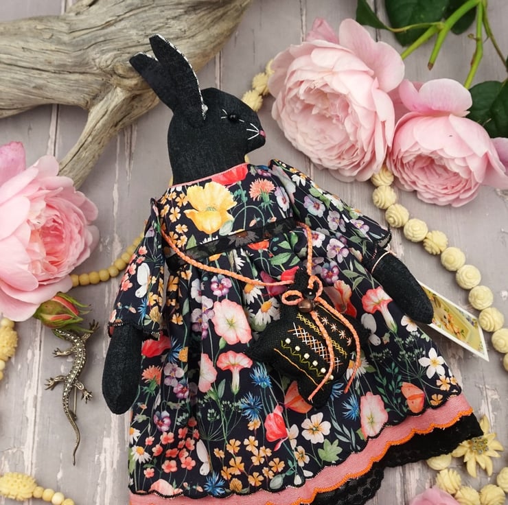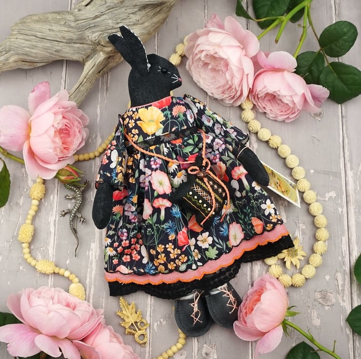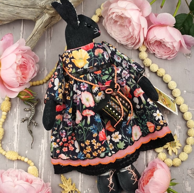 Cora is a tiny midnight bunny lady dressed in a lovely Liberty Lawn called Jude's Garden, a black ground with a floral garden running across the fabric. She has rosemary in her stuffing with a citrine crystal to her heart, hand embroidered features and a little pompom tail. She is finished with tiny buttons, organza ribbon and little black leather shoes.