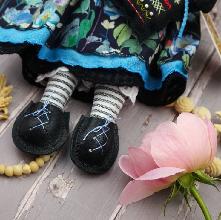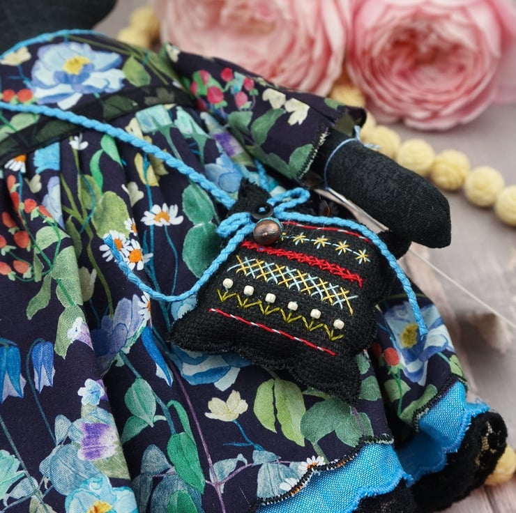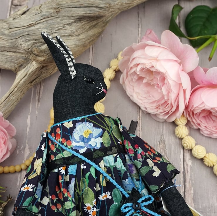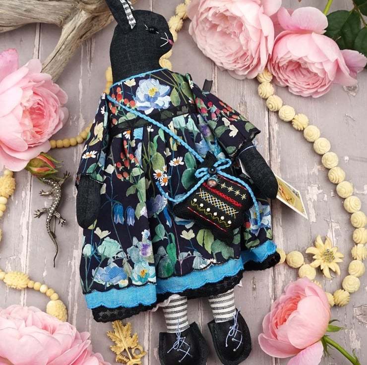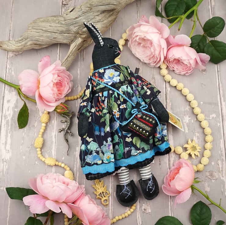 Nell is a tiny midnight bunny lady dressed in a lovely Liberty Lawn called Fairytale Forest, a black ground with a floral garden running across the fabric. She has rosemary in her stuffing with a citrine crystal to her heart, hand embroidered features and a little pompom tail. She is finished with tiny buttons, organza ribbon and little black leather shoes.