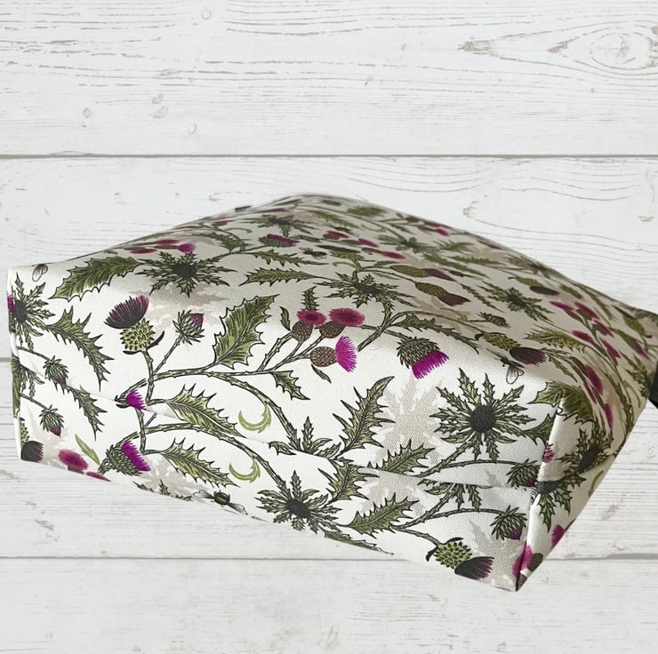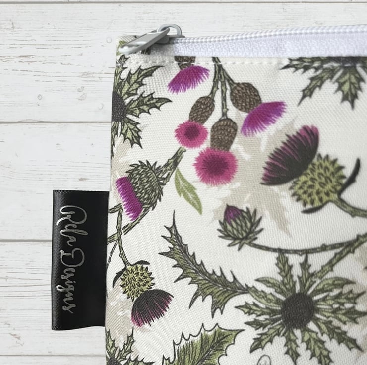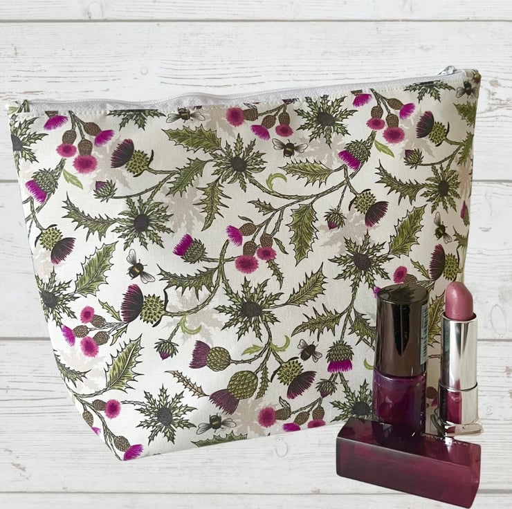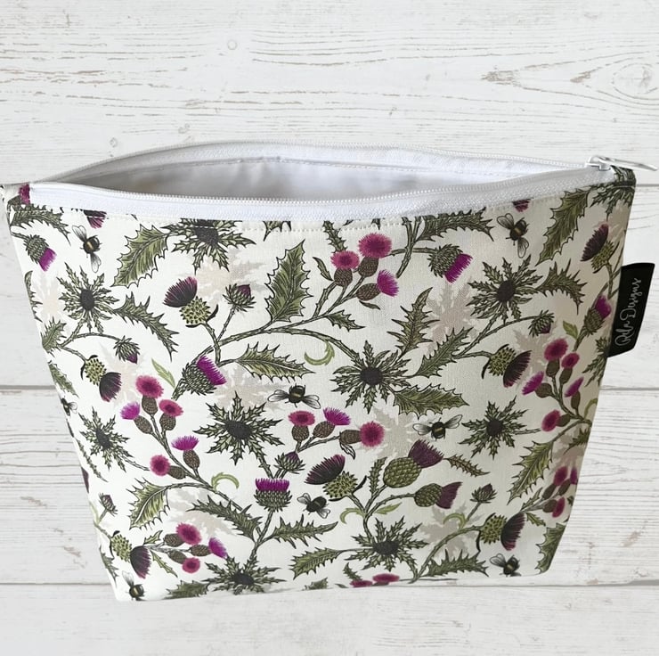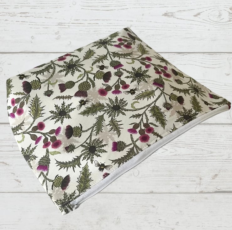 This gorgeous thistle and bee print by Lewis & Irene cotton zipped pouch has a white waterproof nylon lining , great for those inevitable spills.