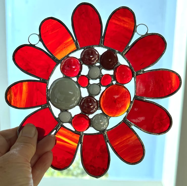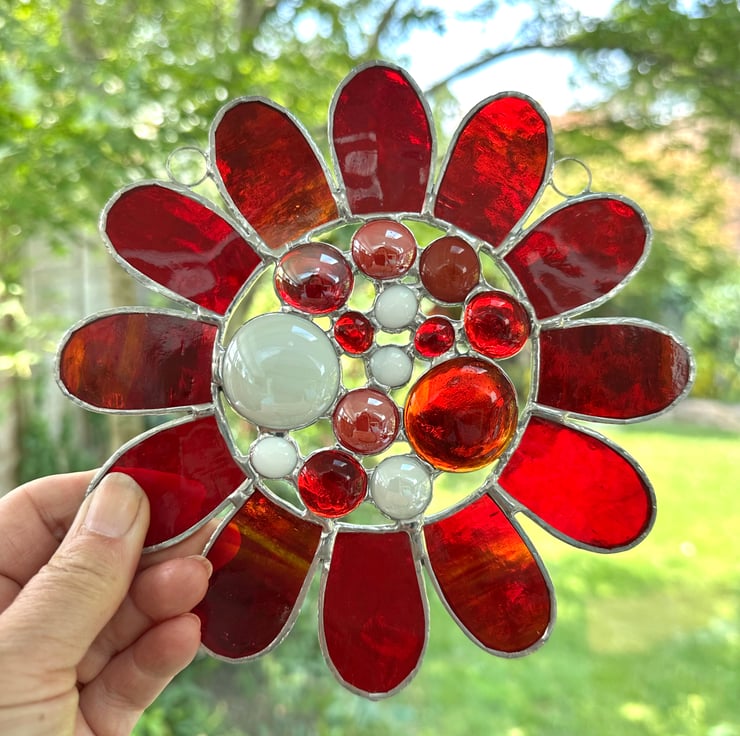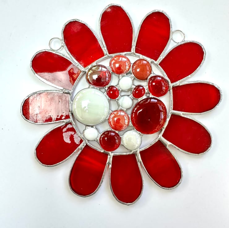 This has been made using 2 different types of red coloured stained glass with a selection of red and white glass globs in the middle. It’s a great way to show all the different textures in the glass.