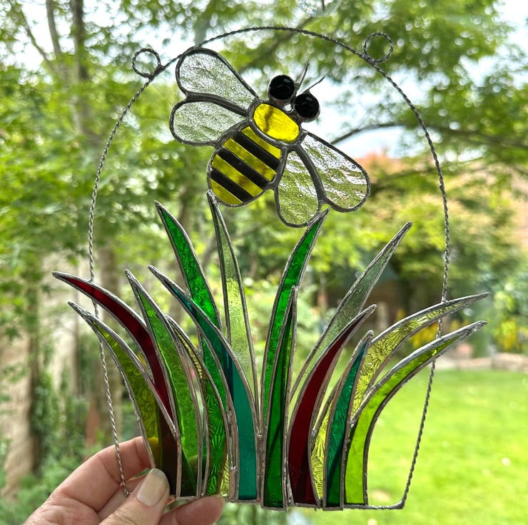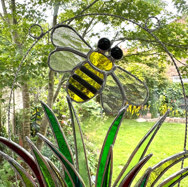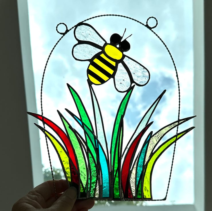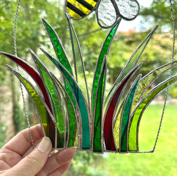 The grasses have been made from 5 types of green stained glass, ranging from very light to dark green and red and turquoise glass. The bee has been made from yellow water glass and clear textured glass for the wings.