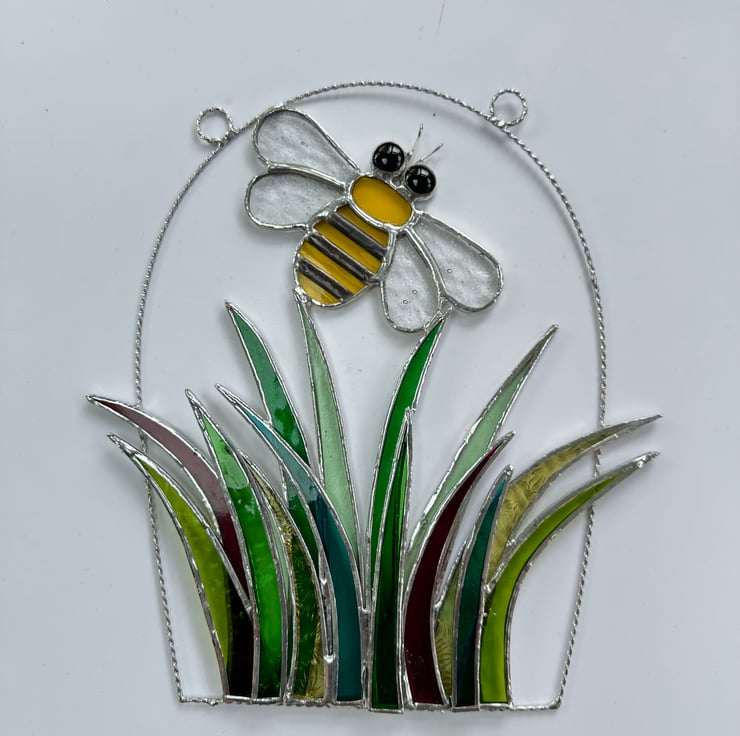 Each piece of glass has been hand cut, ground foiled and soldered together. A patina has been applied to the stripes on the bee to blacken the solder. Tinned twisted copper wire has been added to form the wire surround and two rings and a length of fishing line attached for hanging purposes.