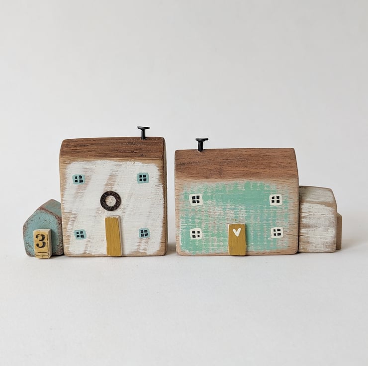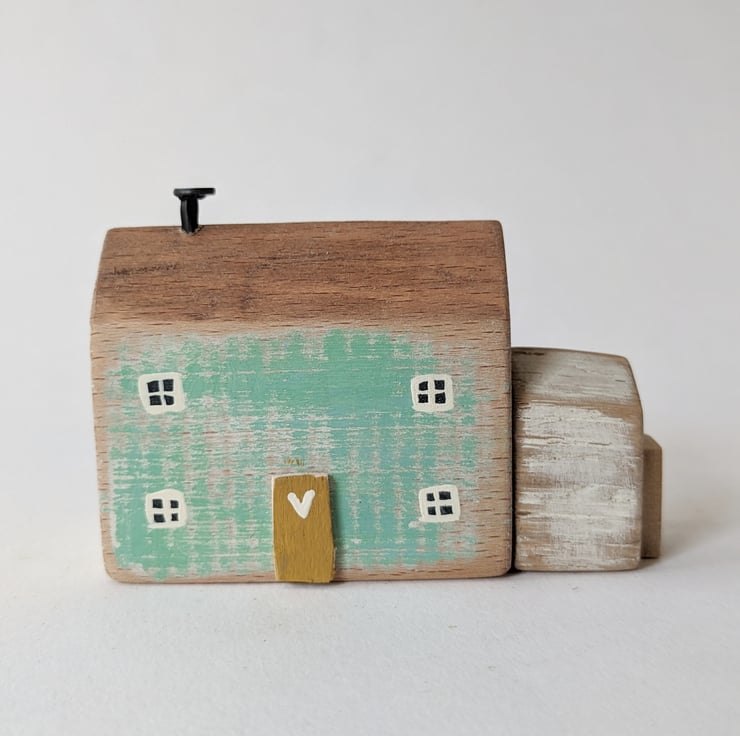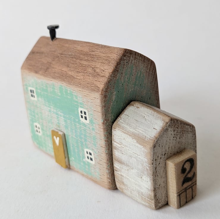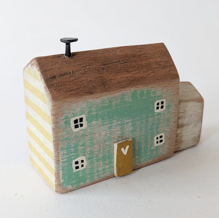 This little wooden house has been hand carved and painted and each piece is one of a kind.