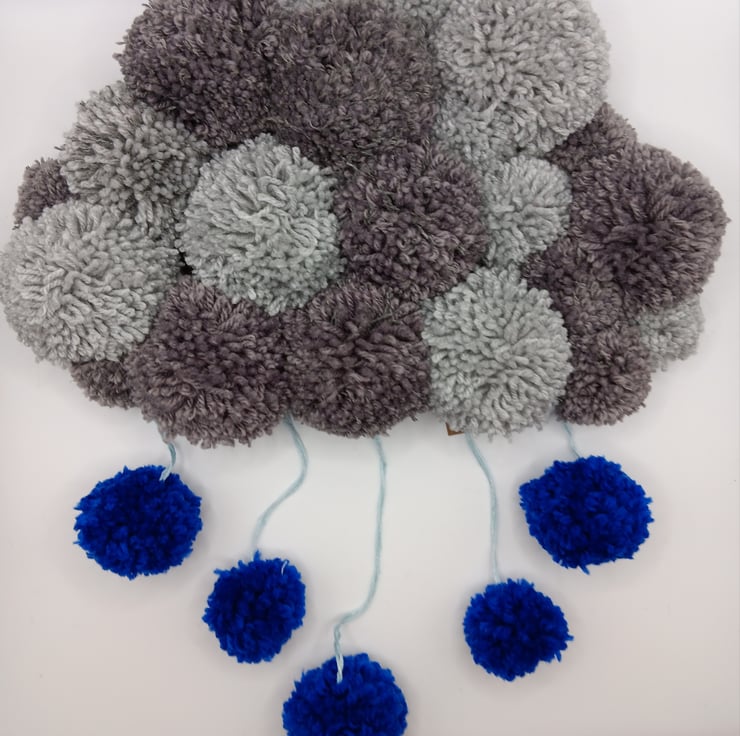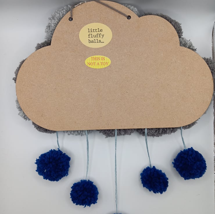 Pom pom hanging cloud approximately 34cm across 40cm in length and 8 cm depth made of mdf and little fluffy balls, for indoor use only . Free postage.