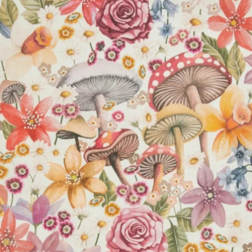 Inspired by the dream-like world that Lewis Carroll imagined in his story of Alice's Adventures in Wonderland , Curious Land depicts a magical floral world of enchanted flowers and peculiar mushrooms that bring the design to life.