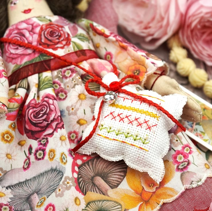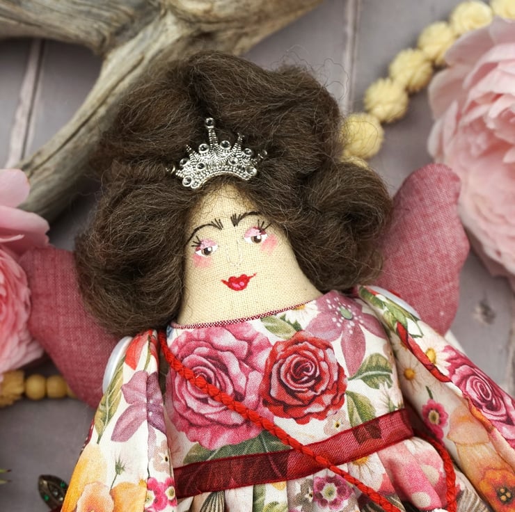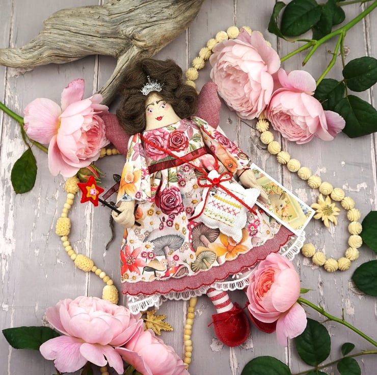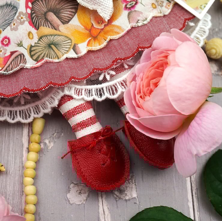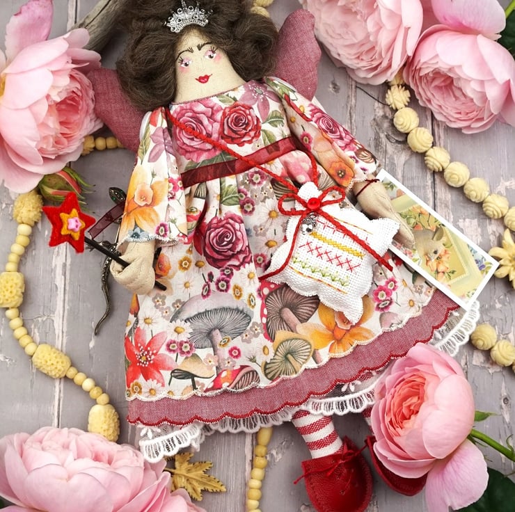 This is Hilde. A smaller pattern, she is about two thirds the size of my witch. She has a hand embroidered and hand painted face with hand styled wool tops hair in a brunette colour. This little Fairy God Mother has a Liberty tana lawn print dress in reds and pinks called Curious Land. She has wings that match her underskirt and sports a little felt wand. Her shoes are the smallest I have ever made and are leather. She has a piece of rose quartz to her heart with rosemary in her stuffing and is finished with tiny buttons, rich burgundy organza ribbon and a little coronet in her hair.