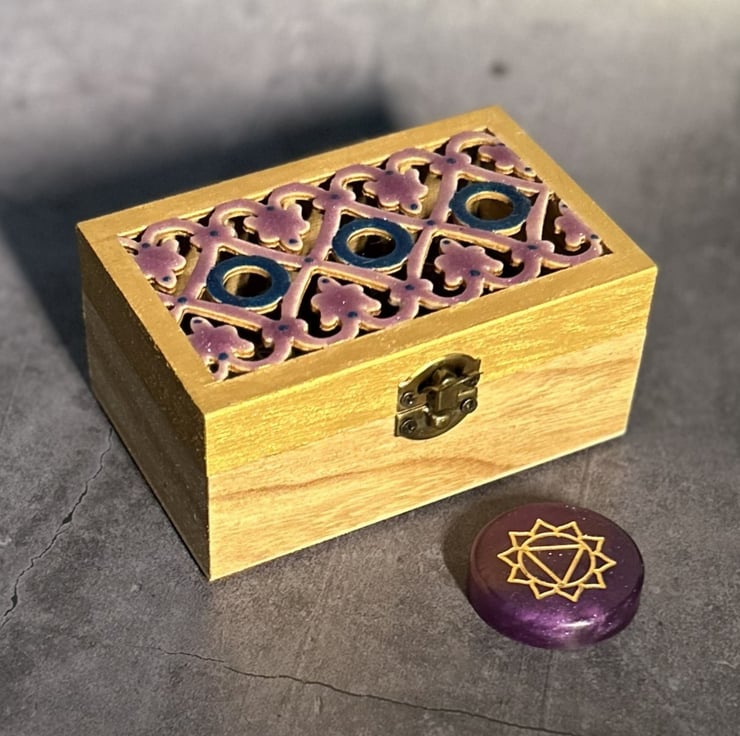 Set of 7 resin Chakra stones, rounds or medallions in a rich deep purple and gold colour. Made from eco friendly resin from a trusted UK supplier and hand painted with gold acrylic paint. Each stone has a hand painted Chakra symbol and the set comes with a half painted box, the other half has been polished using beeswax to protect it and add a lovely sheen. The lid has a cut out design and the top has been top coated in coloured resin. The inside of the lid has been hand painted again and the bottom lined in felt fabric as has the bottom of the box.