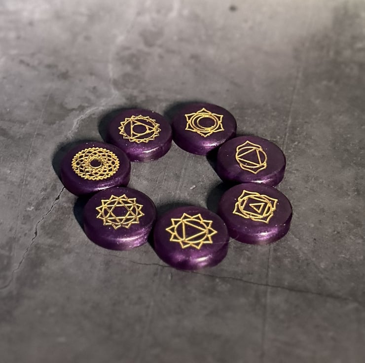 Each resin stone is embedded with a Chakra symbol representing the 7 Chakra energy centres: