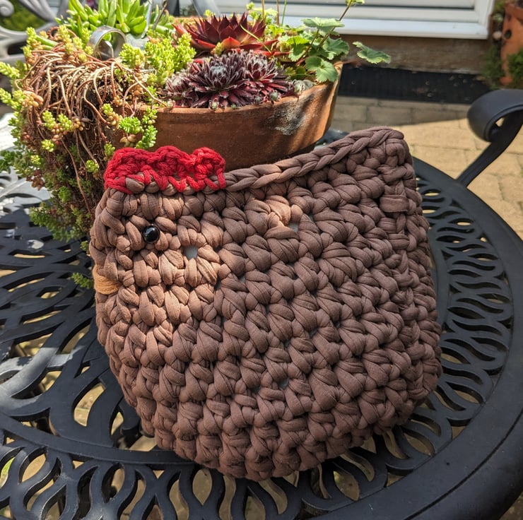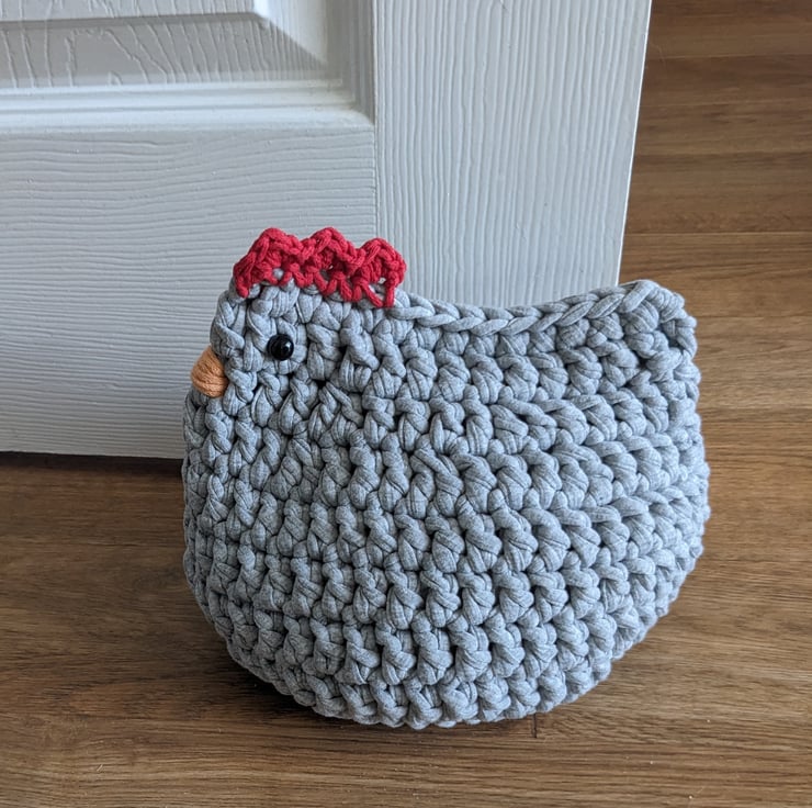 Crocheted from recycled T shirt yarn the chicken is filled with kiln dried sand. This is encased in a plastic food bag inside a fabric bag with additional polyester stuffing to enhance the bird's shape. The beak and comb are made from recycled braided cord and the plastic domed button eyes are securely attached with strong thread.