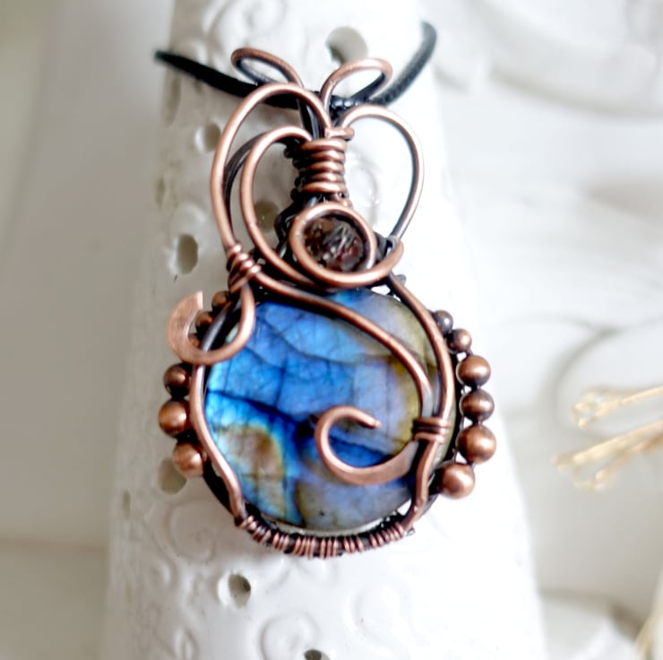 Crystal size is 46 x 20 mm. The copper has been antiqued and a single crystal bead is attached as an accent.