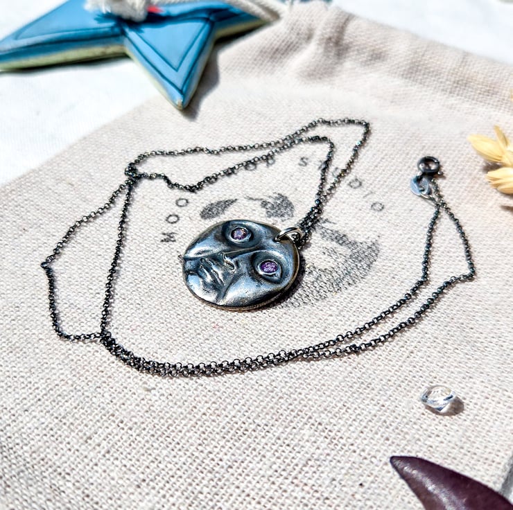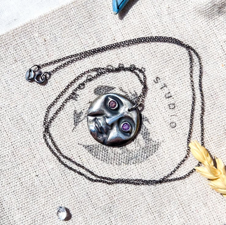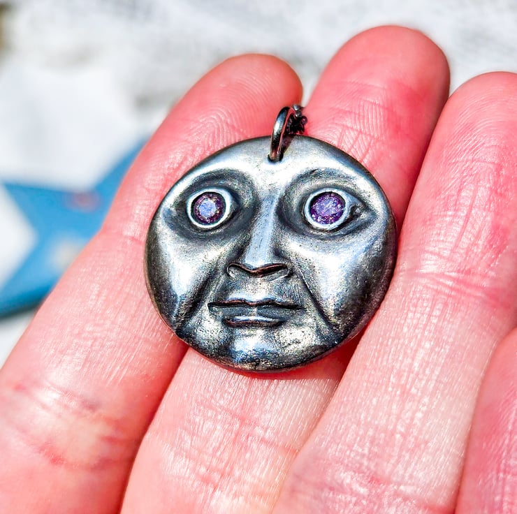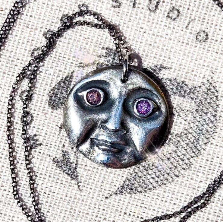 As discussed, you will receive: X1 custom Moon face necklace, handmade and cast using recycled solid fine silver and faceted Amethyst gemstone eyes.