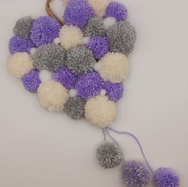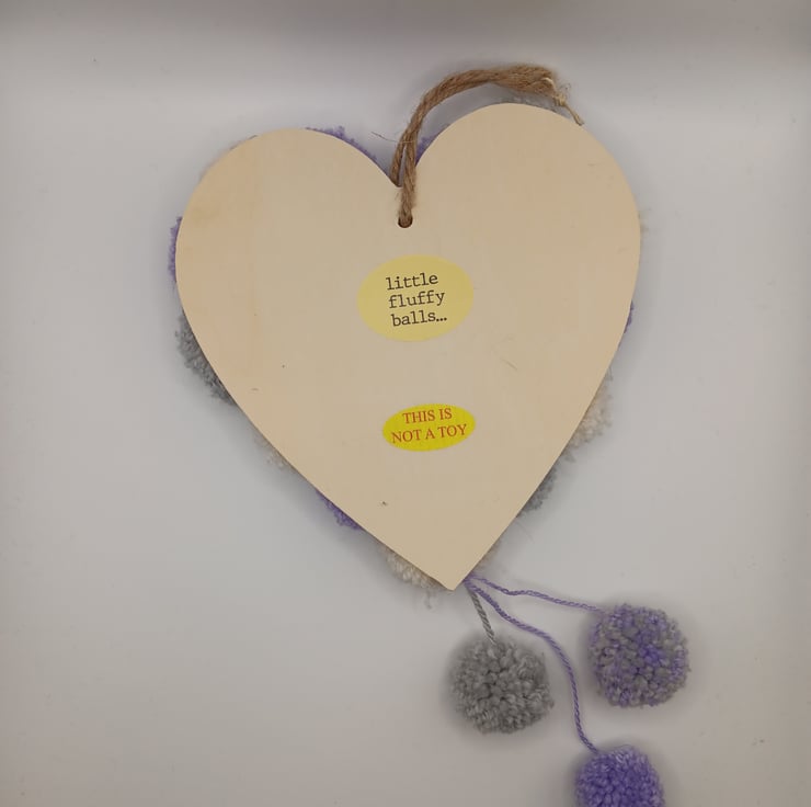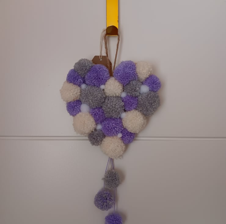 Pom pom hanging heart approximately 22cms across 36cm in length and 4cm depth made of mdf and little fluffy balls, for indoor use only . Free postage.