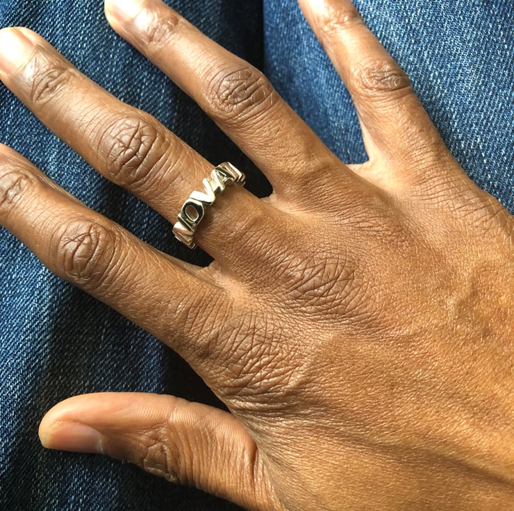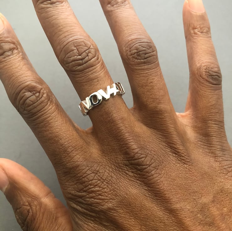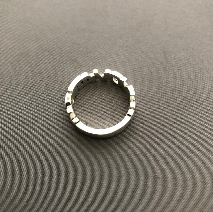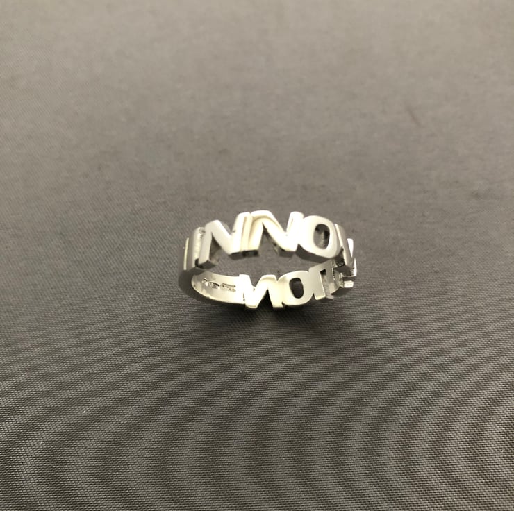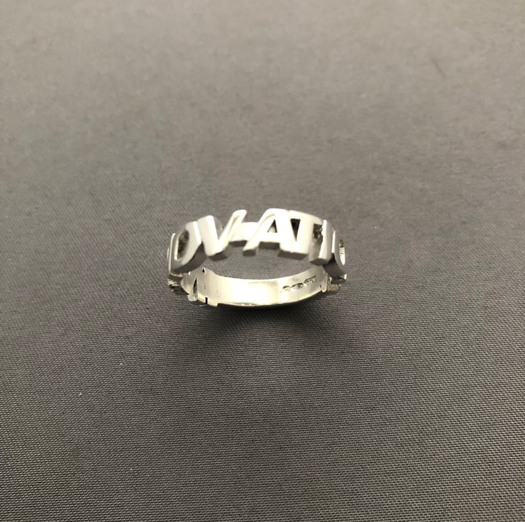 This is a solid sterling silver innovation ring in uppercase writing, the weight of this ring is 5.5 grams finger size is R and can be sized to any finger size just message me your size.