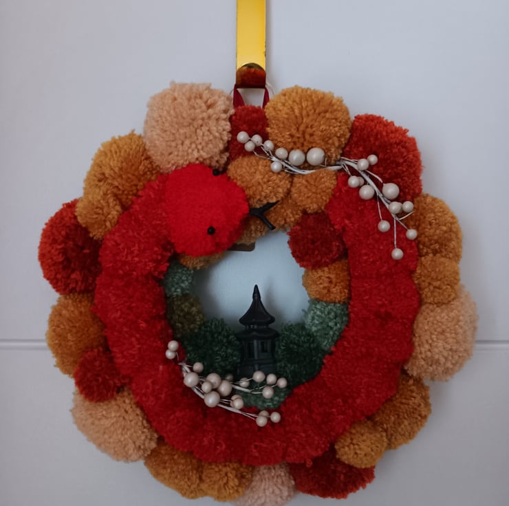 Pom pom hanging wreath approximately 30cms diameter, and around 10cm in depth made from polystyrene and little fluffy balls, for indoor use only . Free postage.