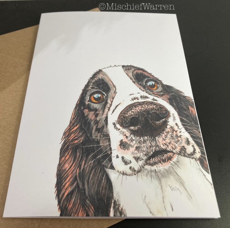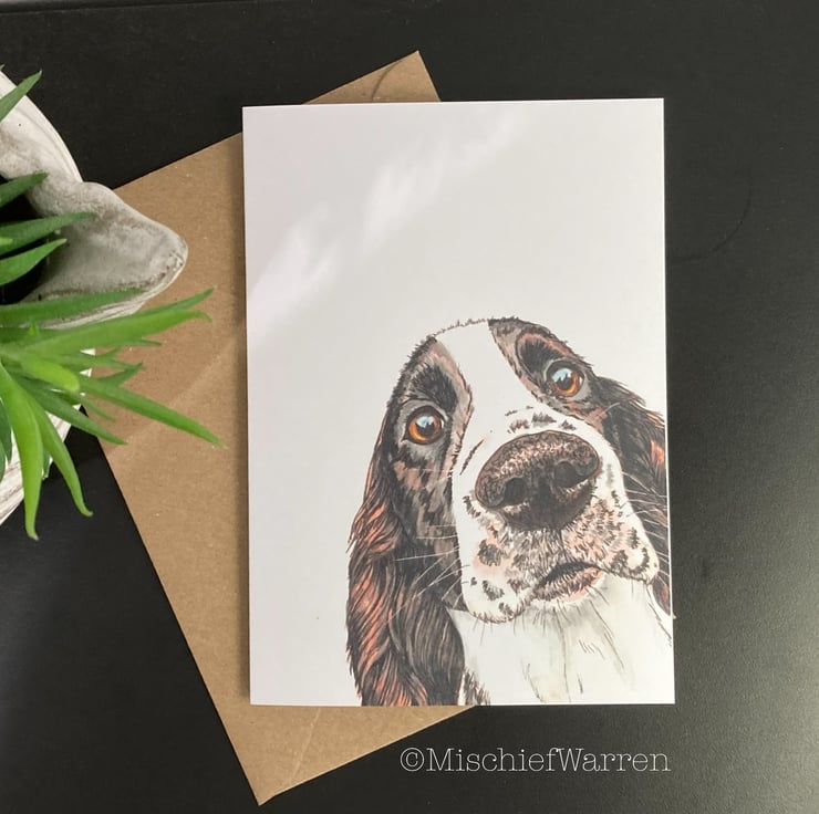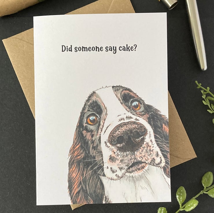 Working cocker spaniel birthday card (or personalised for any occasion; birthday, Valentine’s day, Mothers Day, Fathers Day, Thank you, Wedding, Anniversary or Christmas perhaps). This blank brown and white spaniel dog card features a print of my original hand drawn and painted illustration of a liver and white spaniel. I particularly like the sentiment "Did someone say cake?" which covers any celebration involving cake.