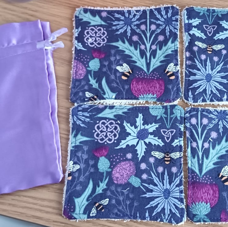 Eco friendly, reusable face wipes. 100% cotton with soft white bamboo towelling on the reverse, a gorgeous floral thistle and bee design on a purple background with a satin lilac drawstring storage bag. Each pack contains four wipes and comes with free delivery.