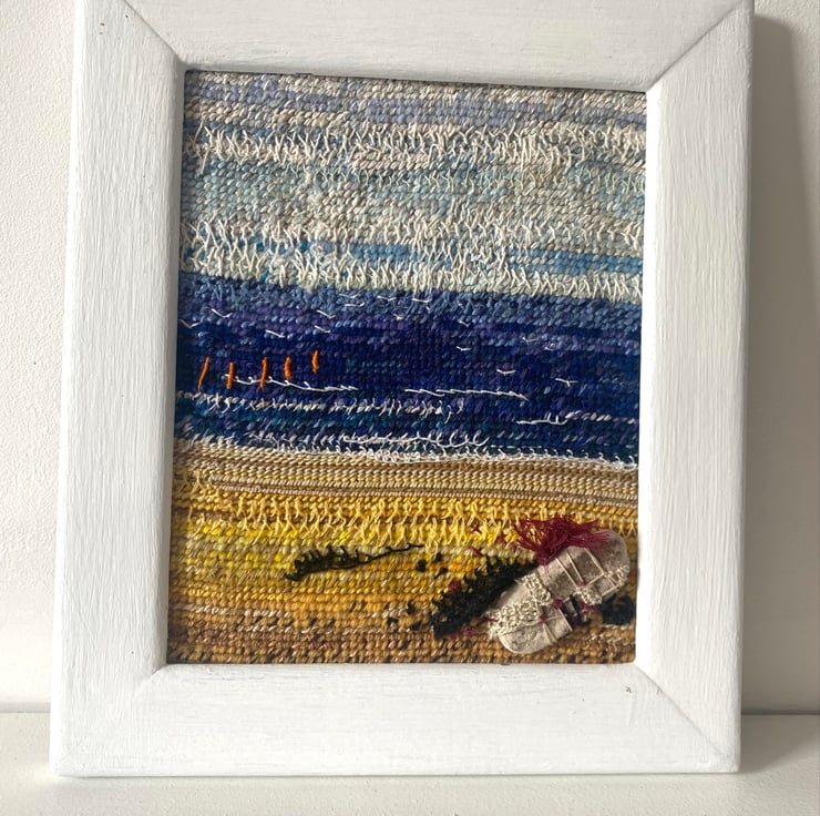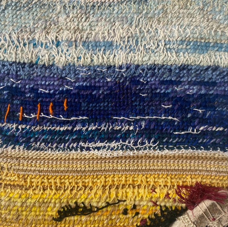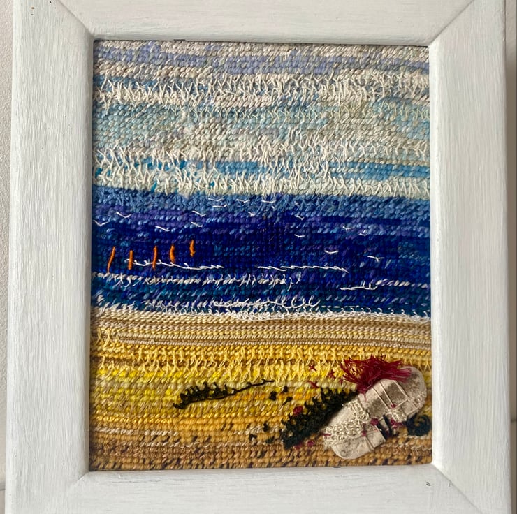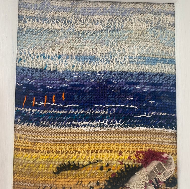I’ve incorporated a stone and a piece of plastic waste, found while walking. They are secured in place on the beach with stitching.