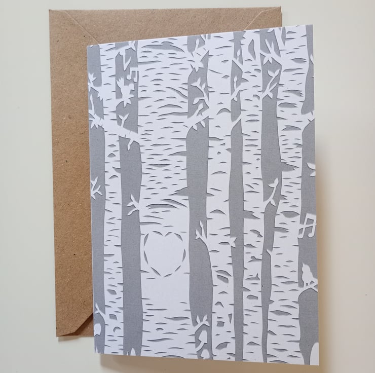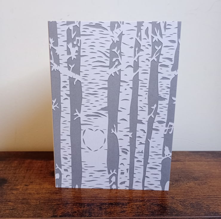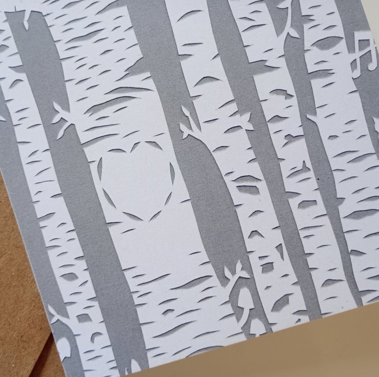 Eco-friendly printed greeting card. Image is of my papercut depicting a birch tree with a carved heart, making this ideal to give for an anniversary or wedding! Birch is the traditional gift for 25th anniversary, also known as a silver anniversary.