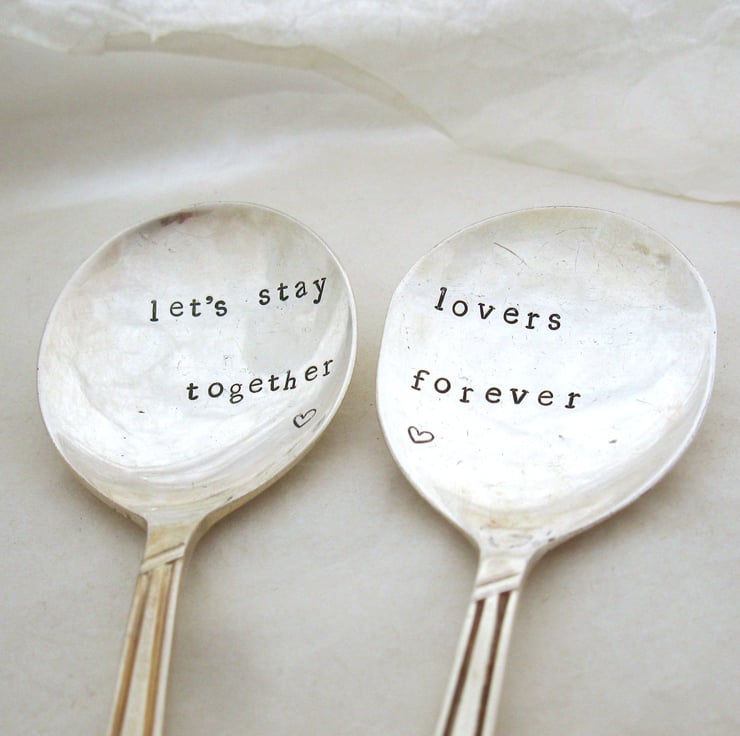 A matching pair of silverplate floral fruit or dessert spoons, hand stamped with complementary romantic wording. One says 'let's stay together' and the other says 'lovers forever' and each has a little heart. When you put them side by side the wording lines up to say 'let's stay lovers together forever' and the two hearts are next to each other. So you can each have one spoon and when you bring them together you have the complete inscription. Perfect for a valentine, wedding or anniversary gift or could be used as an unusual wedding proposal!