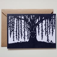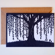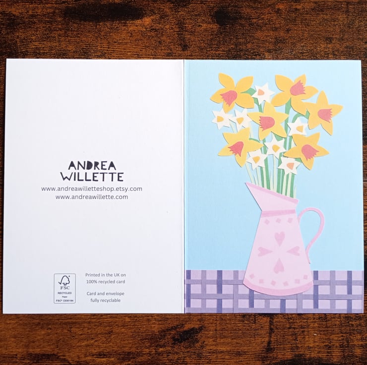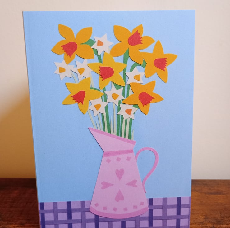 Printed greeting card of my papercut of spring daffodils in a jug - perfect for birthdays, mother's day, to let someone know you're thinking of them, or just because.