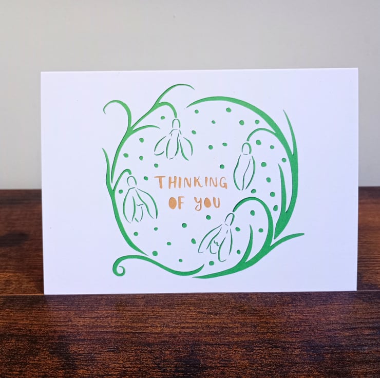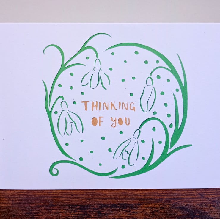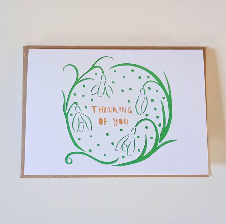 Eco-friendly greeting card. Print is of my original papercut of a snowdrop design around the text 'thinking of you'.