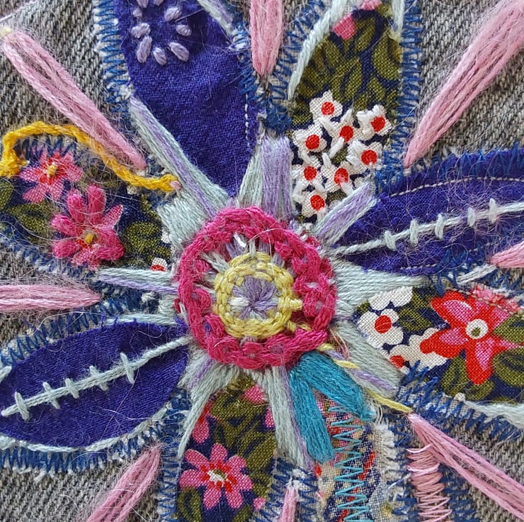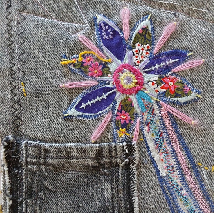 Appliqué flower with hand embroidered stitches and free motion machine stitches.