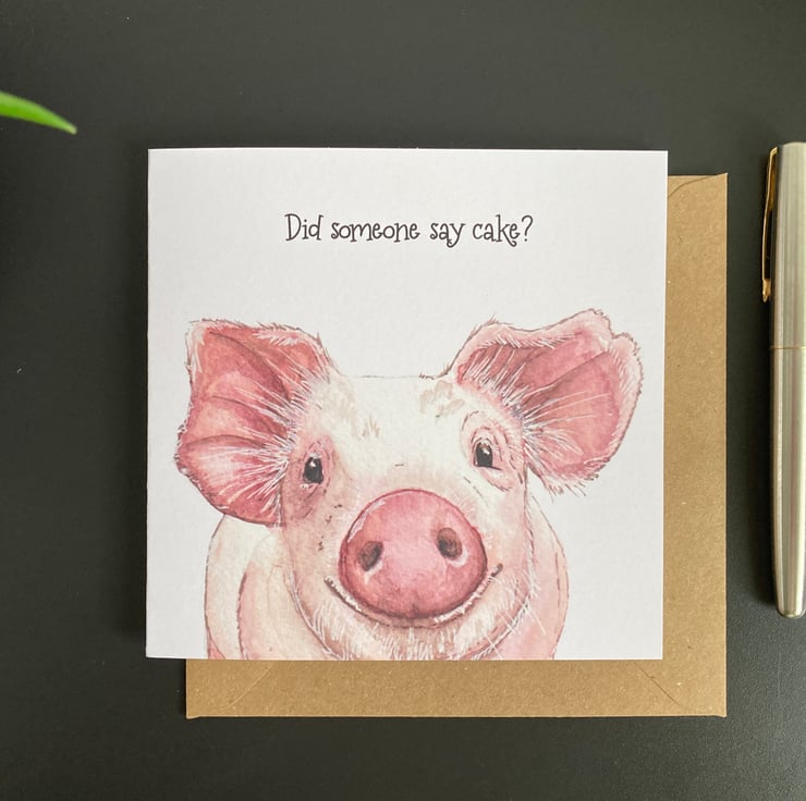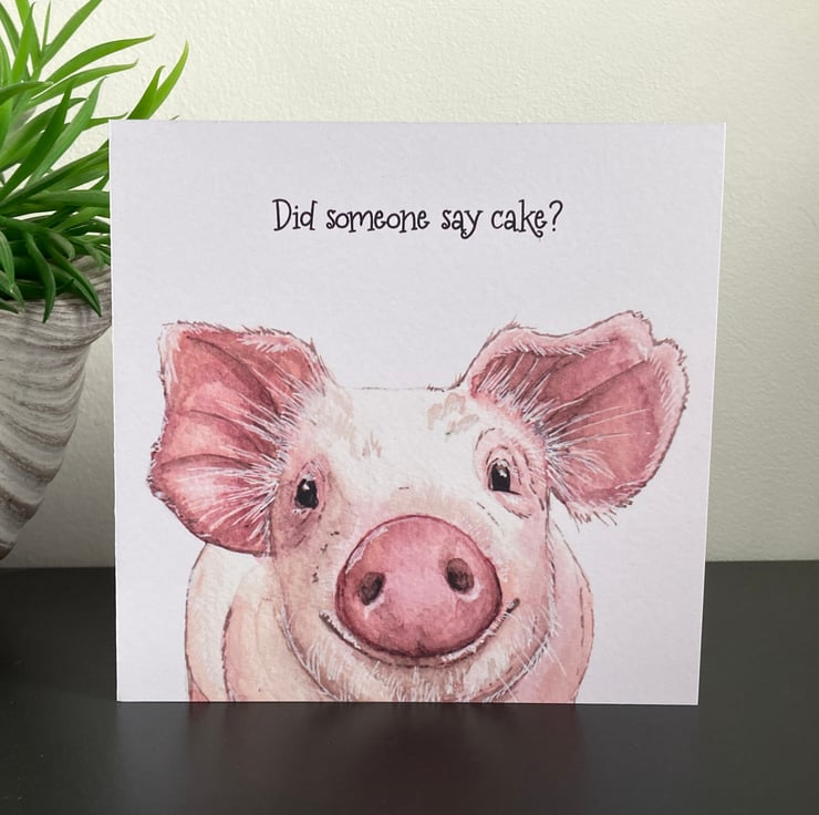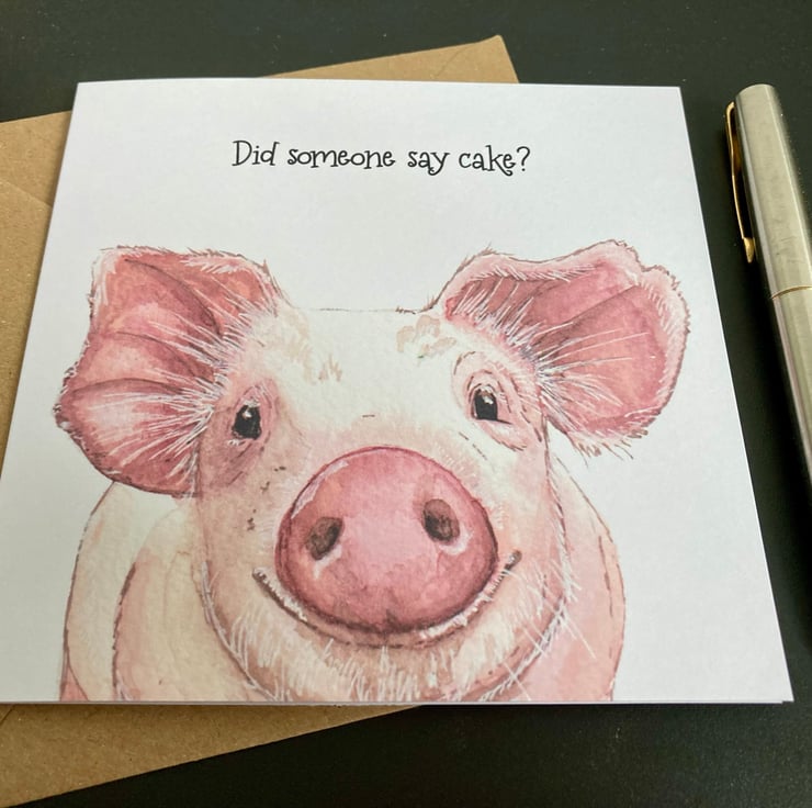 Pig birthday card (or personalised for any occasion; birthday, Valentine’s day, Mothers Day, Fathers Day, Thank you, Wedding, Anniversary or Christmas perhaps) for pig lover. This blank piglet card features a print of my original hand drawn and painted illustration. I particularly like the sentiment "Did someone say cake?" which covers any celebration involving cake.