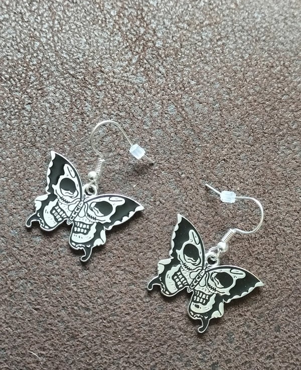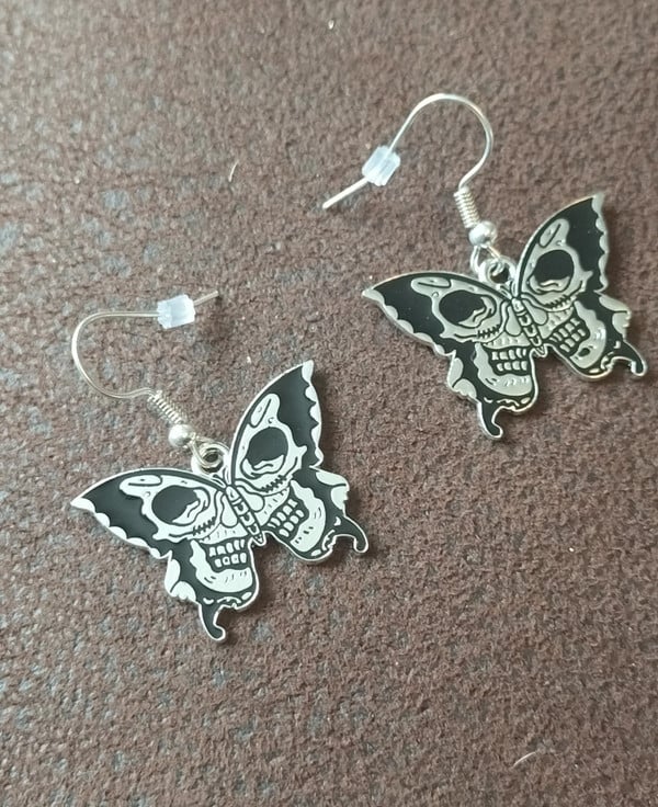 Tibetan silver dangle butterfly and Skull earrings, with silver plated wires, they will come with the backs. Black enamel.