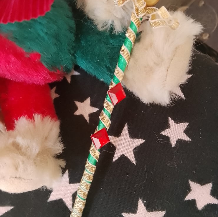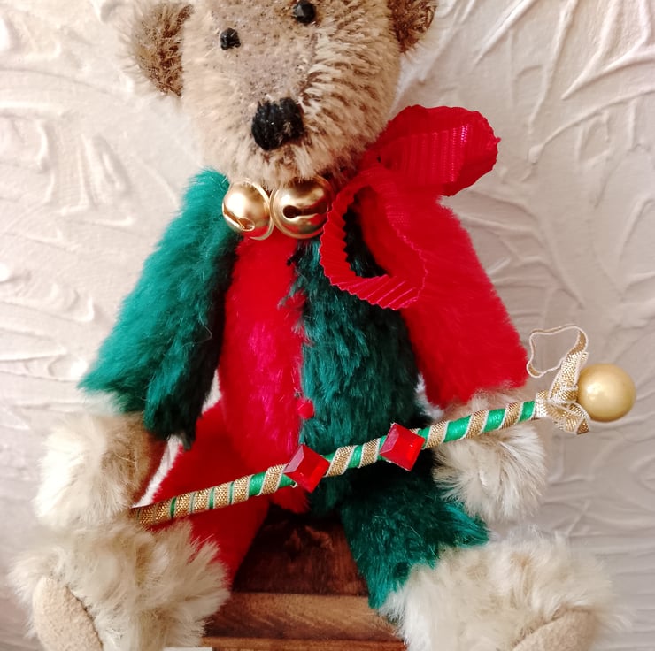 Meet Beau, a one of a kind multicoloured Mohair Bear. Beau is 4 way jointed and made of high quality mohair, a longer pile for the body, arms and legs, a sparse mohair for his head. He is filled with white polyester filling which conforms to British Safety Standards. His eyes are multi faceted beads and he has a gold star in one ear. He stands (will need support) 8 inches high and is almost 6 inches high sitting. He has a decorative stick with a large bead on the top.