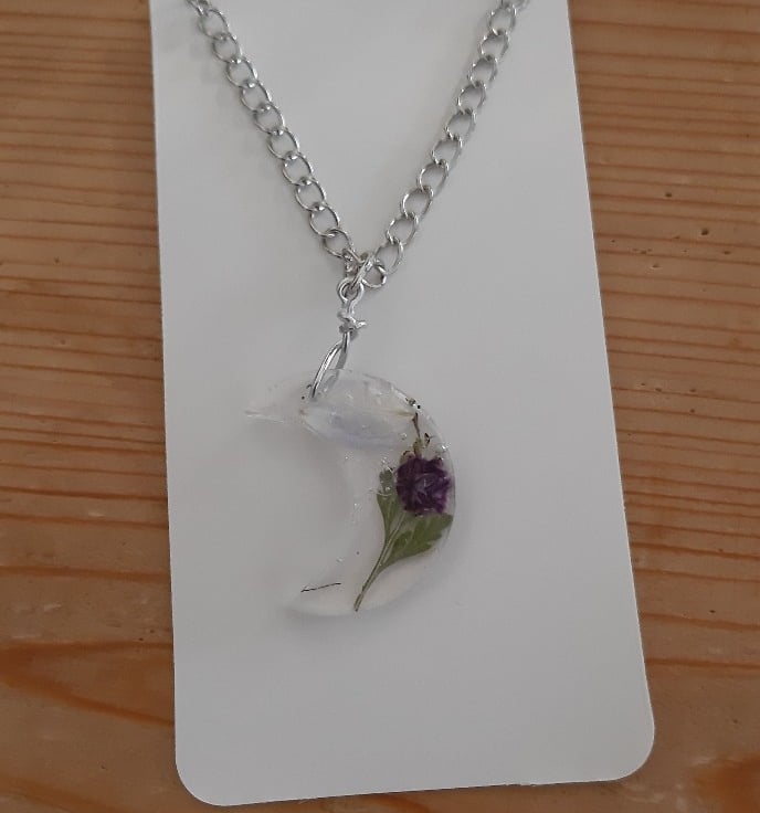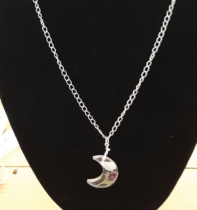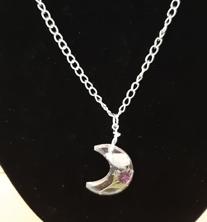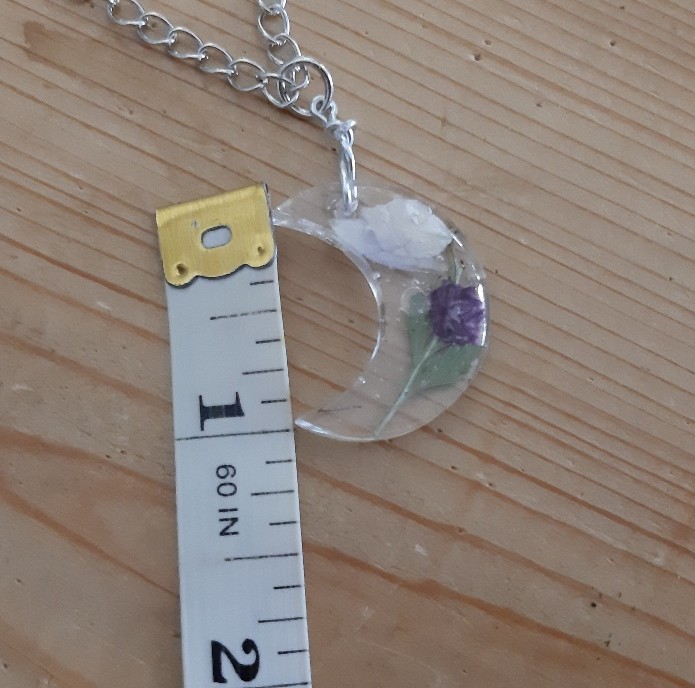 Moon-shaped resin pendant on a long, 19.5 inch silver coloured chain.