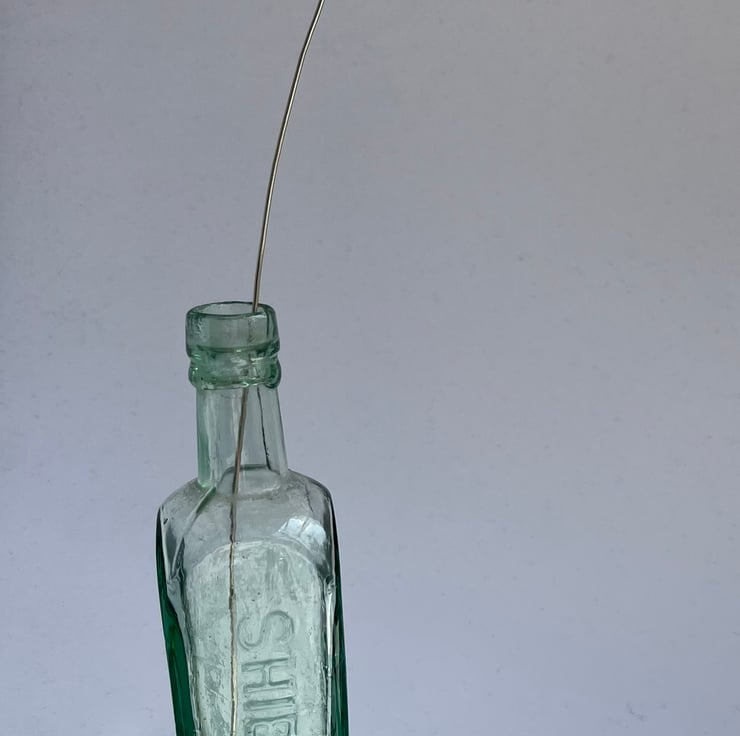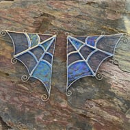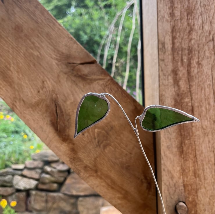 Two heart shaped stained glass leaves on a wire stem. Handmade from dark green ripply stained glass and tinned copper wire.
