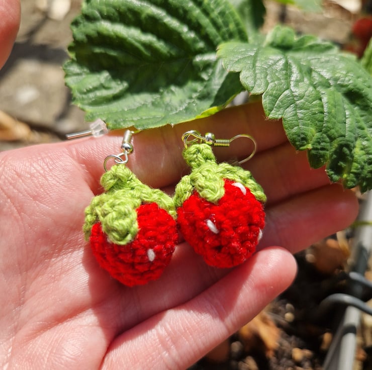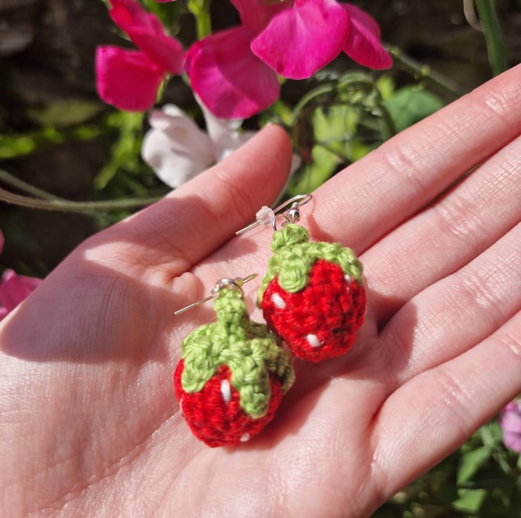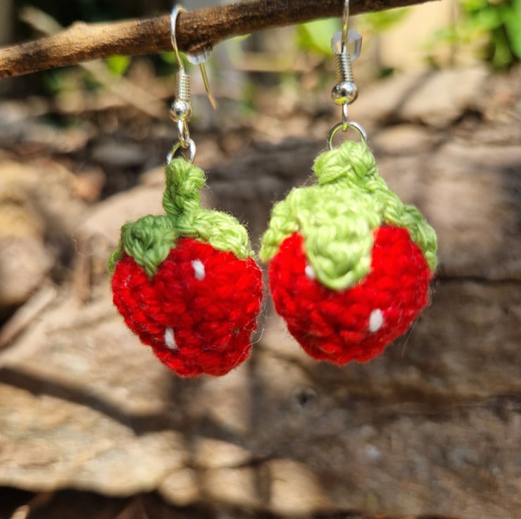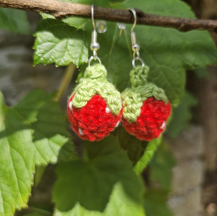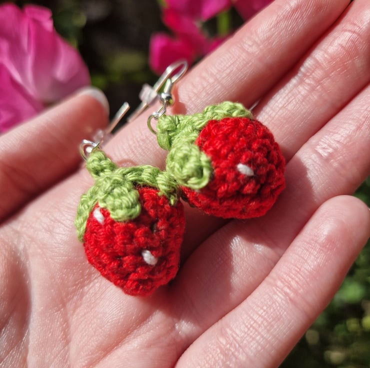 A pair of strawberry dangle earrings, handcrafted from lightweight red and green cotton thread and recycled polyester filling. The earrings are silver plated hooks, with the option of including small silicone backings.