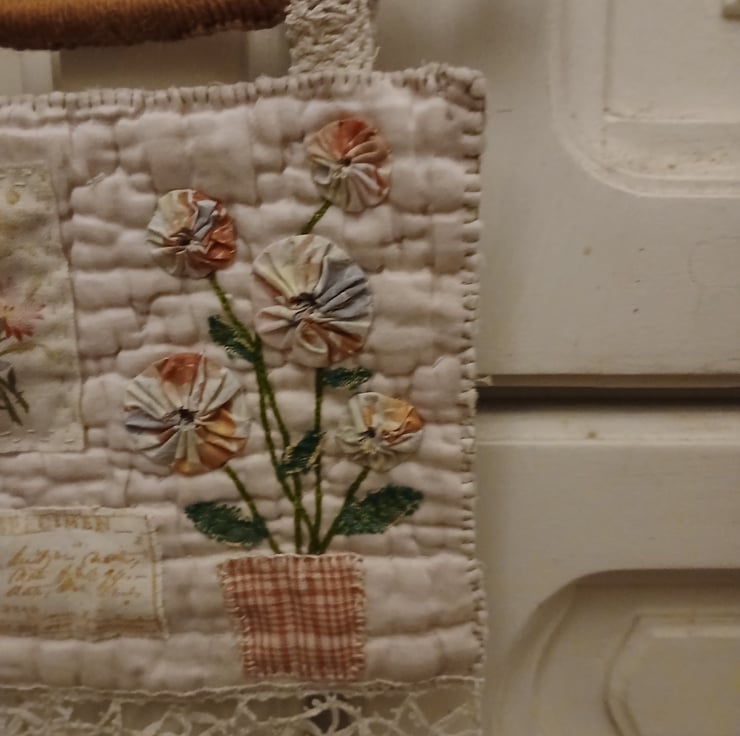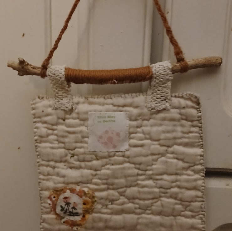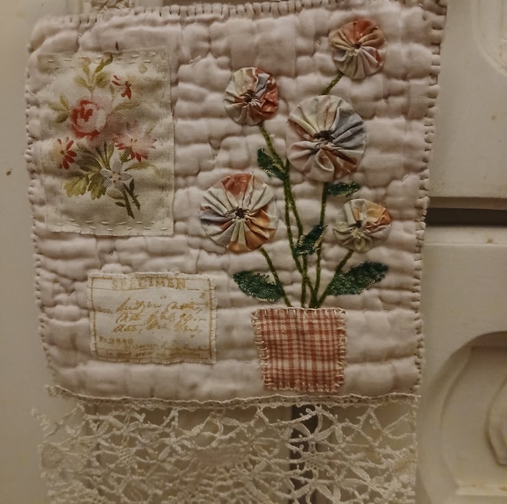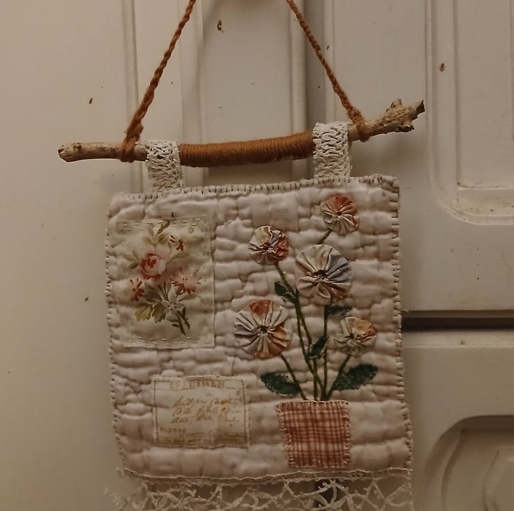 Hand-stitched textile art made from vintage and new fabrics. Inused a piece of vintage quilt as a base and created 'flowers' from suffolk puffs with embroidered stems and fabric leaves, all sitting in a red checked 'vase'. Further decoration includes a printed label, a floral image and lace. Itsvhung from a wool-wrapped stick through lace loops and a plaited wool hanger.